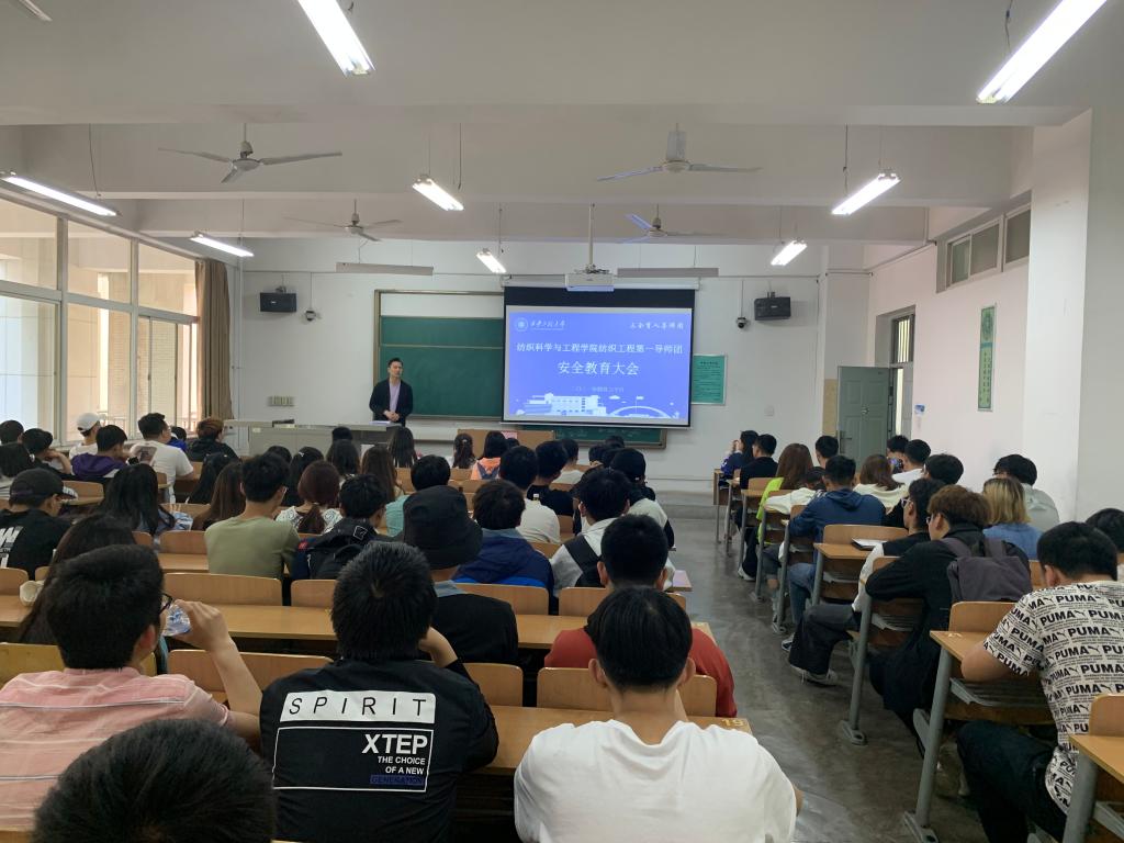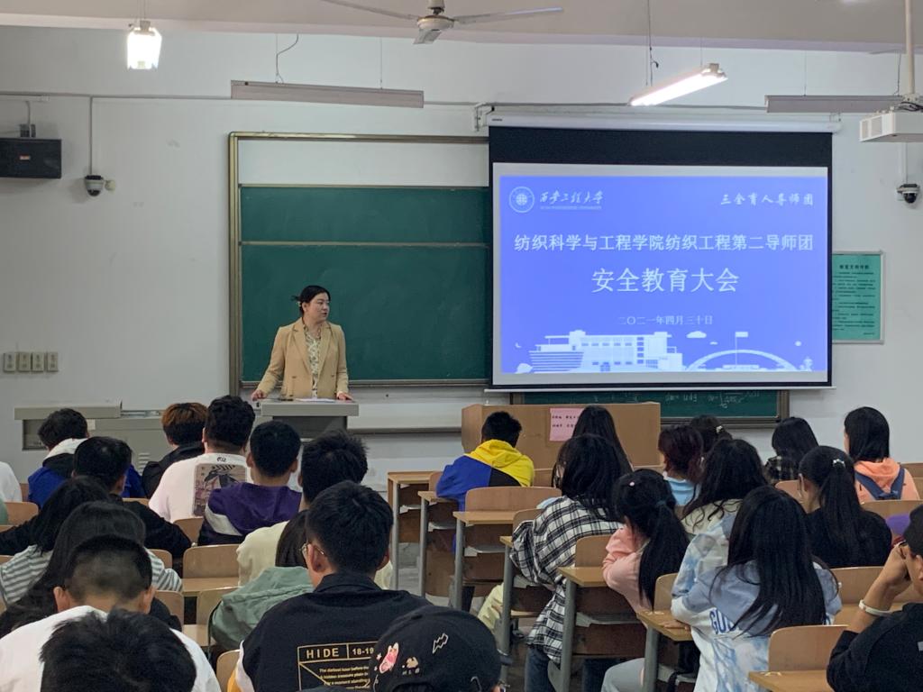 2021年4月30日,纺织科学与工程学院三全育人导师团在临潼校区A-132教室举办五一假期安全主题教育大会。纺织工程第一导师团秘书、2020级辅导员曹鑫,纺织工程第二导师团秘书、2019级辅导员苏娜,2019、2020级全体寝室长参加活动。
