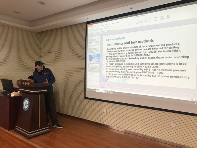 课堂上,拱老师采用全英文教学模式,主要是从纺织品测试的检验原理、各国标准、误差分析等入手,结合图片和示例介绍了纺织品检测项目的设计思路以及如何客观、准确地呈现测试结果。学生在课堂上抬头率高,课堂气氛活跃。在全英文教学过程中,对于较专业的词汇,拱老师会辅以形象的图片为学生进行详细解读。拱老师采用了其在英国曼彻斯特大学的教学理念和教学模式,结课作业是以小组为单位,完成纺织品的综合测试项目,并通过PPT进行汇报。在综合类测试项目中,同学们需根据织物类型及最终用途设计测试项目以及选择测试标准,并要求在汇报时逻辑清楚地阐述设计思路、原因以及结果分析,汇报后拱老师和其他小组成员进行提问和点评,整个环节均为全英文。授课结束,拱老师还给学生介绍了曼彻斯特大学,以及英国教育的特点和优势,并建议学生要进一步提高英语表达和应用能力,并争取有机会赴国外大学进行学习深造。