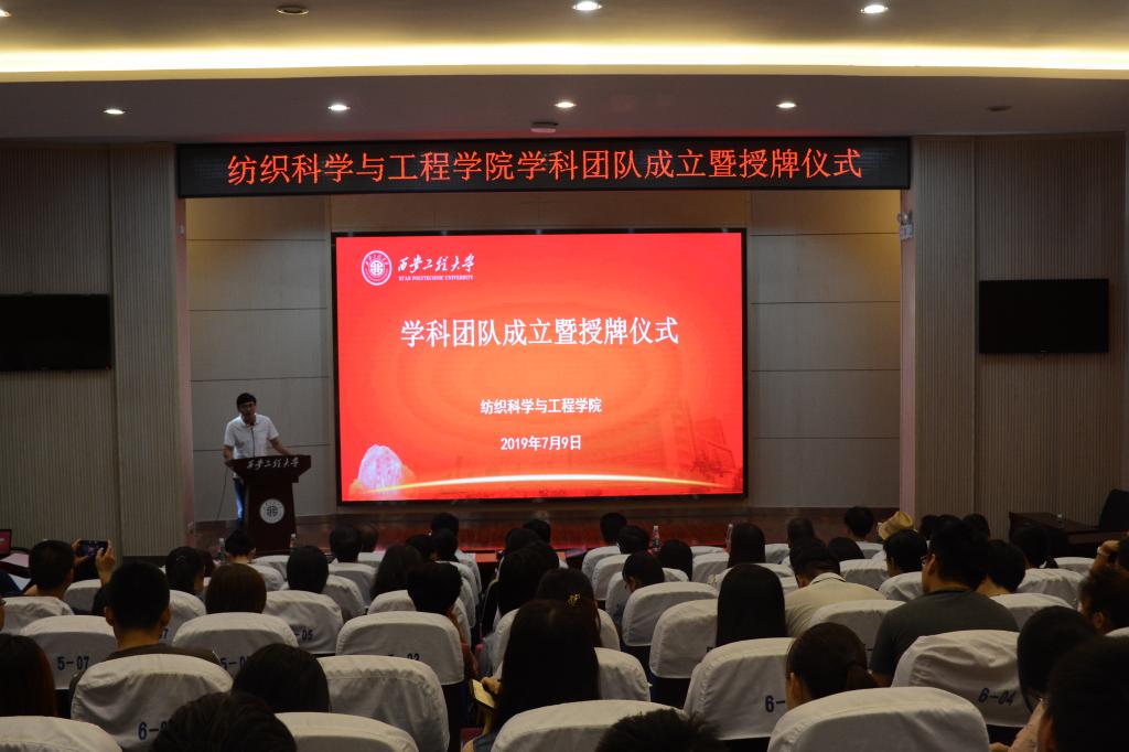 2019年7月9日,纺织科学与工程学院在金花校区西纺报告厅召开了学院首批学科团队成立暨授牌仪式。校党委书记刘江南、副校长李鹏飞,科技处处长朱耀麟,纺织学院党政领导班子成员,各团队负责人及成员,学院全体教职工和部分研究生代表参加了会议。会议由学院党委书记胡小进主持。