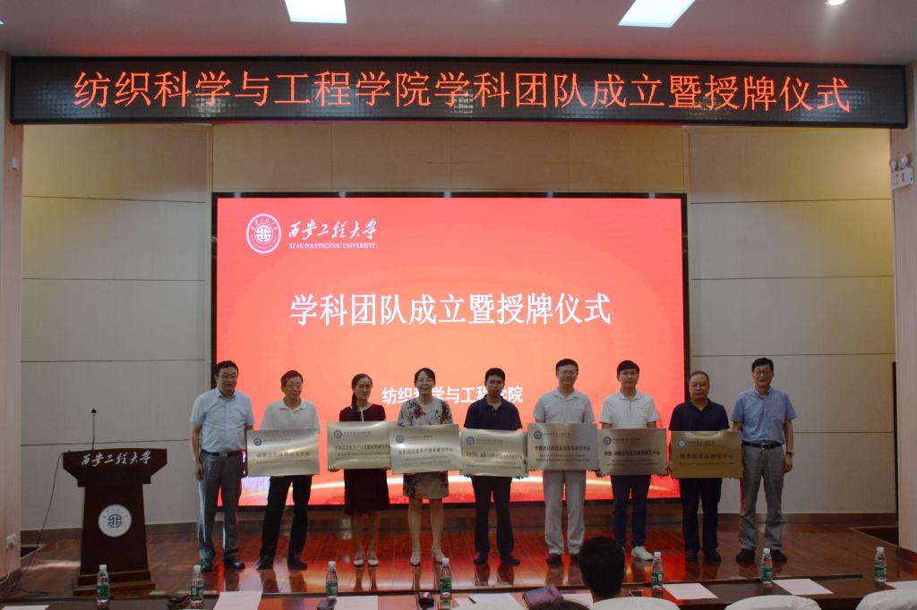 会上,院长李翼汇报了学院学科建设及团队组建情况。他强调根据学院学科建设方向,经各团队申请,学院教授委员会初审,聘请校外专家答辩把关,学院党政联席会研究决定,最终确定了支持建设的首批7个学科团队。同时,勉励培育团队进一步凝练方向,完善建设申报书后再进行支持。执行院长孙润军宣读了《纺织科学与工程学院关于成立首批学科团队的决定》,并代表学院与团队负责人代表签订了目标任务书。校领导刘江南、李鹏飞为首批成立的7个学科团队进行了授牌。学科团队负责人代表樊威结合自身经历进行了发言,并代表团队表态一定努力加强团队建设、带领大家为学院发展贡献更大力量。
