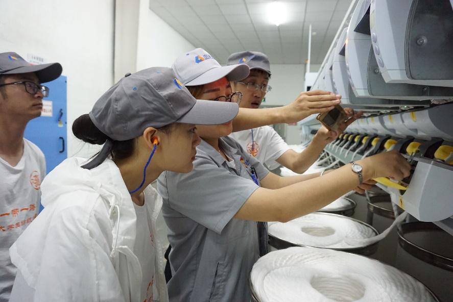 四川省玻纤集团一个拥有40年历史的老牌国有企业,经过40年的艰苦奋斗,公司已成为国内外享有盛誉的专业生产玻璃纤维的骨干企业。本次实践队员们有幸在谢光银老师带领下在此展开本次实践。培训室内,杨主任、唐经理、常工、杜工分别介绍了介绍了公司历史、玻纤用途、生产工艺、瑕疵处理;厂房实地参观考察,玻璃球被高温熔融然后拉成4-9微米的玻璃纤维,然后加捻合股,再纺织成玻纤布,经过表面处理,裁剪等多道工序,变成客户要求的具有特殊功能的玻纤布成品。