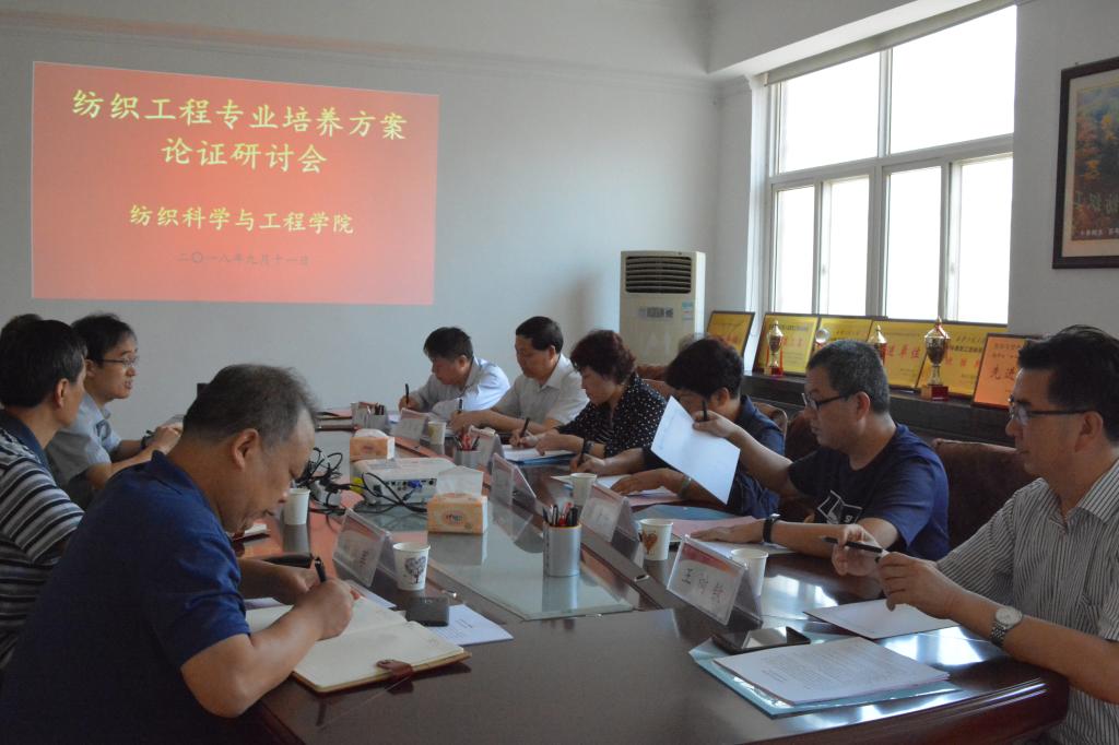 2018年9月11日上午,纺织工程专业培养方案论证研讨会在纺织楼四楼会议室召开。论证专家组成员包括:陕西省纺织行业协会执行会长王树钦、陕西省纺织科学研究院副院长蔡普宁、宝鸡九州公司总经理刘利侠、咸阳纺织集团有限公司副总经理畅娇、西安纺织集团有限责任公司副总经理汪平安、陕西华特玻璃纤维有限公司副总工程师兼技术部经理赵建盈。纺织科学与工程学院院长孙润军、副院长王进美、副院长刘呈坤、纺织工程专业主任谢光银,专业教师支超、余灵婕、王蕊宁、吴倩、黎云玉等参加会议。会议由孙润军主持。