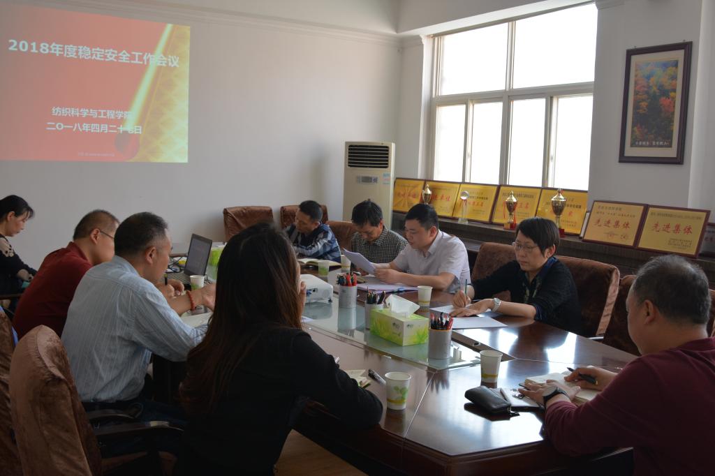 4月27日下午,纺织科学与工程学院党委在金花校区召开2018年度稳定安全工作会议,学院稳定安全和综合治理领导小组成员及各部门安全负责人、安全员参加了会议。学院党委书记胡小进主持会议。