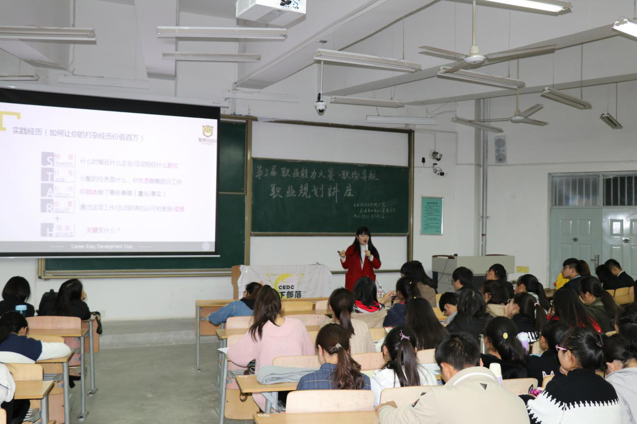 为了让大学生了解社会整体现状,对职业规划有一个初步认知,同时为了响应我校第三届职业能力大赛,11月7日19时俄罗斯294专享会CEDC当下部落于临潼校区教学楼B座233室开展了“职场导航·大学生职业规划讲座”。本次讲座主讲嘉宾为西安觅未来企业管理咨询有限公司市场总监赵丹女士,纺织与材料学院17级近300名同学参加了此次活动。