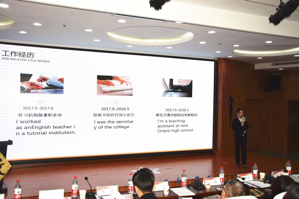 大赛伊始,郭西平老师对成功晋级复赛的27位参赛选手表示祝贺,并希望在场的同学们通过本次比赛都能有所收获。复赛分两组进行,设有“自我展示”和“你问我答”两个环节。选手们用具有针对性且多元化的自我推荐、有思想有深度的答辩向评委们证明了自己的实力。在这两个环节中,选手们展示自己精心制作的ppt,模拟职场面试,他们自信大方的台风博得了现场观众的阵阵掌声。与此同时,评委根据选手们的现场表现对他们做出的细致而中肯的分析点评,使选手们获益匪浅。27名参赛选手的表现都十分出色,其中,来自纺织科学与工程学院的陈俊宇凭借着她渊博的学识和自信铿锵、富有张力的现场表现获得了评委老师的青睐;来自电子信息学院的李梦璐娓娓道出了自己对高校辅导员工作独到的理解和想法,落落大方的表现引起好评如潮;来自理学院的刘娜用自己对高中数学的独特理解:数学教学不仅要重视技巧的讲授,还要注重基础的夯实。随后袁群老师和张勇老师对本次大赛进行了点评,对参赛选手的精彩表现予以了肯定,同时也为他们提出了宝贵的意见,选手们都获益匪浅。经过紧张激烈的角逐,陈俊宇、李梦璐、刘娜等十位同学晋级决赛。最后,老师向晋级选手颁发晋级卡并合影留念。