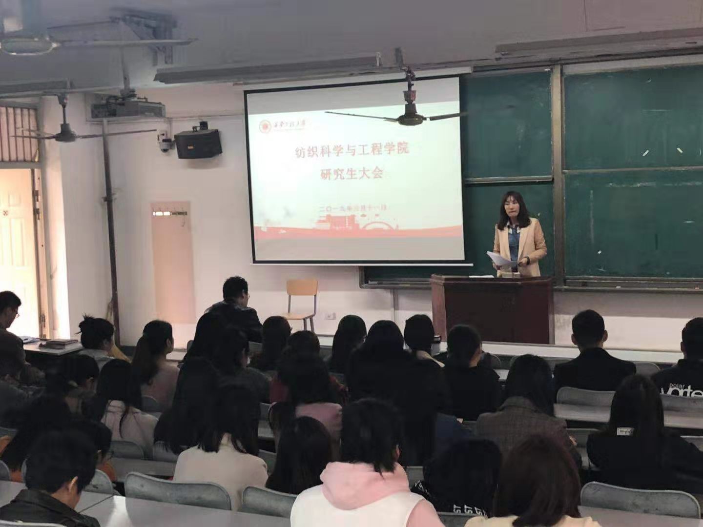 2019年3月11日,纺织科学与工程学院在金花校区主楼228教室召开全体研究生大会,学院党委副书记郭西平、学生工作办公室主任赵勇进参加会议。会议由赵勇进主持。