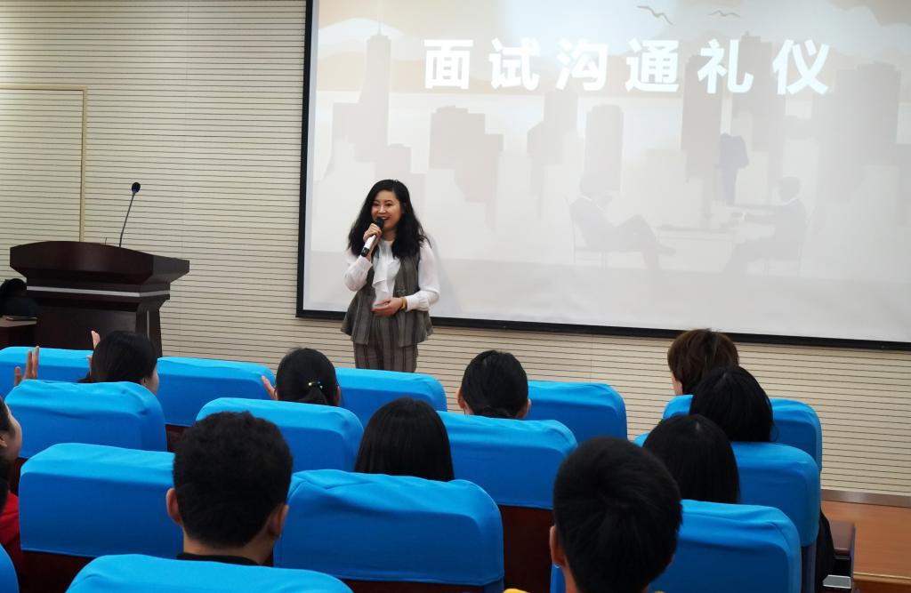 本次讲座邀请中国社会科学院研究生院项目主任,大学生就业指导《面试沟通与礼仪》特聘讲师,国际注册高级礼仪培训讲师杨毅,为学生进行面试沟通及礼仪方面的专题培训。讲座开始,杨毅通过下一个十年你在哪的话题引出大学生在新时代、新征程中要具备新能力,同时强调了择业心态的重要性,告知学生既要有过硬的专业素质,也要注重面试过程中的沟通和礼仪;第二阶段,她以将职业素养安放在凳子上为切入点,带动学生一起学习职场男女生坐姿、站姿、握手、倾听、交流、接电话、递接物品等技能的关键点,带动全场同学一起学习、示范,并指导学生男士穿衣保持“三一”原则、女士服装符合“三色”原则,掌握基本的面试礼仪技巧;第三阶段,她讲授了人际交往的3A法则,指导学生在人际交往过程中要接收对方、重视对方、赞美对方,并通过自己成长的案例来说明人际交往的重要性。
