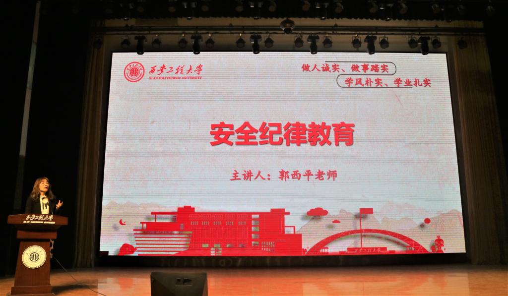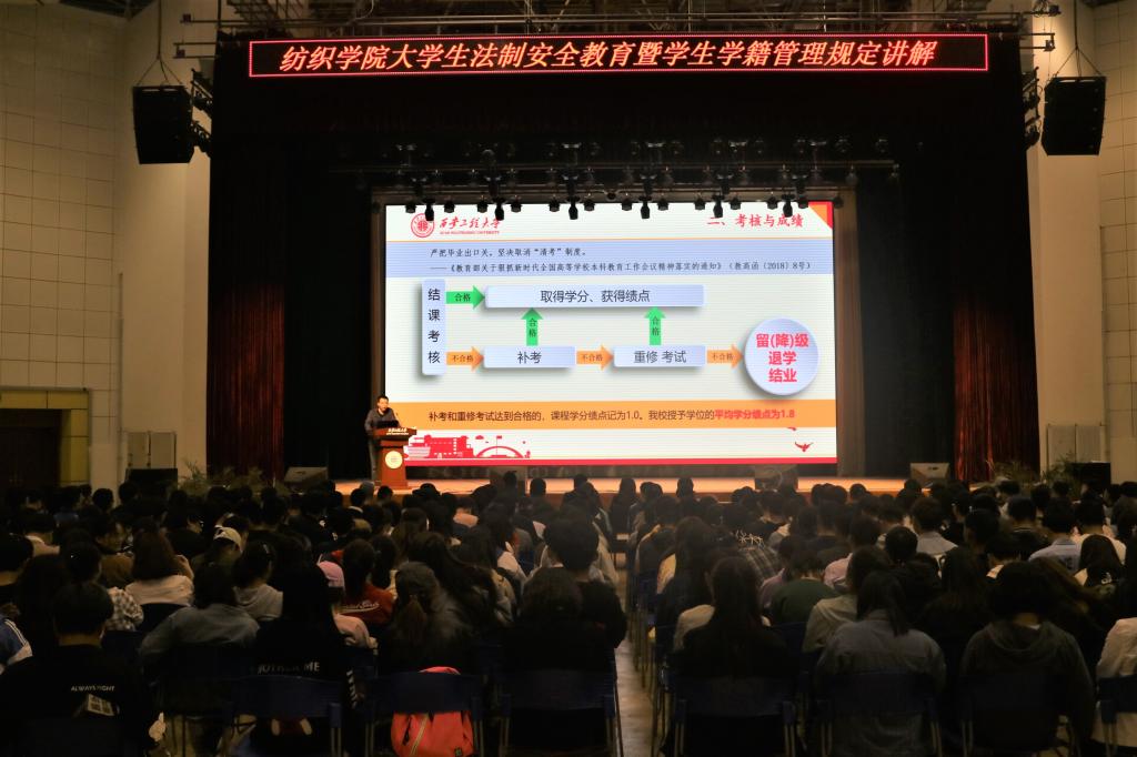 2019年4月11日晚,纺织科学与工程学院在临潼校区大学生活动中心召开了学籍管理、卫生防疫、安全纪律和国家安全教育大会。纺织学院党委副书记郭西平、教务处教务科科长孟锋、校医院杨军宏医生、学院学工办主任赵勇进、2018级辅导员邓恩征出席大会,纺织学院2017级、2018级全体学生参加大会。大会由赵勇进主持。