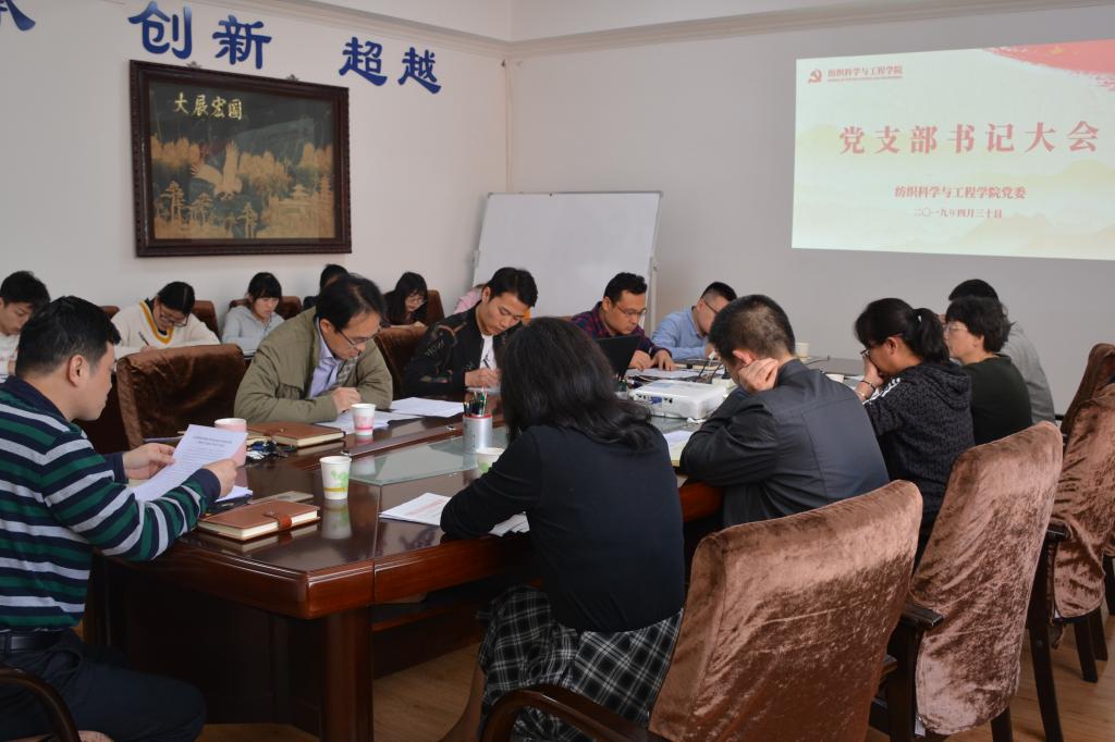 4月30日,纺织学院党委在金花校区纺织楼4楼会议室召开学院党支部书记大会,传达学习上级有关会议和文件精神,安排2019年学院党委重点工作,部署各党支部近期工作。学院党委书记胡小进、副书记郭西平、各党委委员和全体教工、学生党支部书记参加会议。会议由胡小进主持。