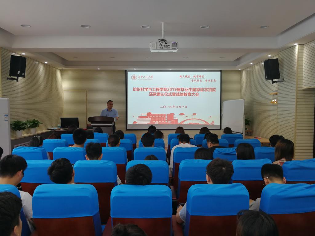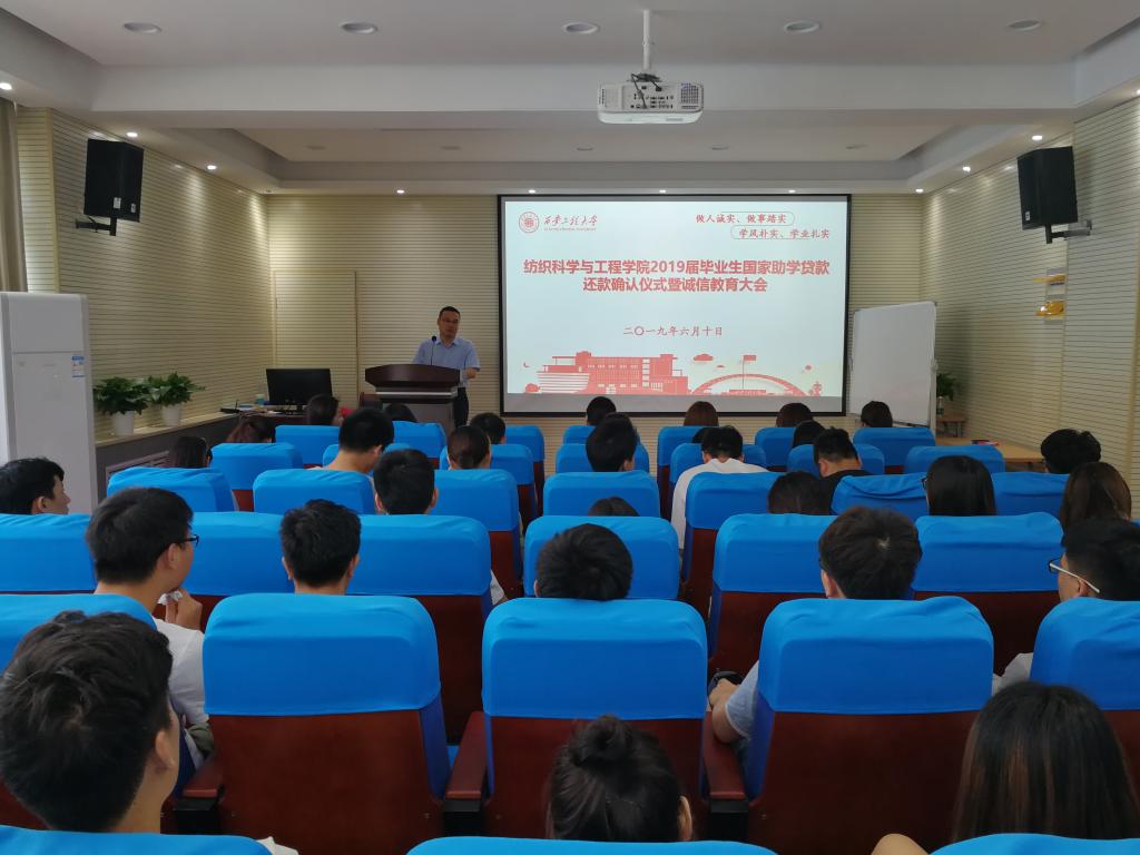 2019年6月10日10时,纺织科学与工程学院在金花校区姚穆报告厅举行2019届毕业生生源地贷款还款确认仪式暨诚信教育大会,学院学生工作办公室主任赵勇进出席大会,2019届生源地贷款本科生和研究生参加大会。大会由辅导员邓恩征主持。