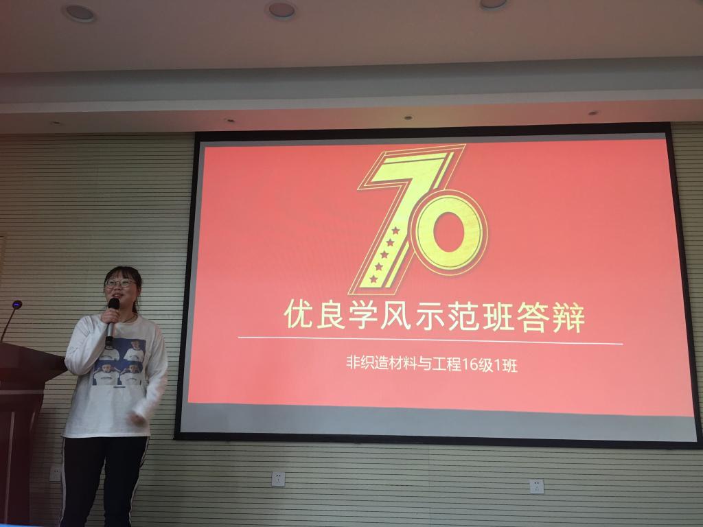 答辩会以2016级纺织工程2班的PPT展示开场,班长彭江伟用富有激情的语言展示了班级风采中,班级活动合照展示了独有的青春与活力,数据统计图有力地展示了班级取得的优良专业成绩。随后上台参加风采展示的其他班级也不甘落后,数量众多的个人与班级荣誉证书、奖状等显示了他们在德智体美等各个方面取得的优异成果。最后进行答辩的2018级非织造材料与工程1班以认真端正的态度和班团默契的合作给现场评委留下了深刻印象。班级风采逐个展示过后,评委老师针对各班的实际情况作了相应的点评,提出了不少的“巧问”,亦得到了各班代表的“妙答”。经过激烈的角逐,综合各项评分标准,最后评选出2017级纺织工程5班为纺织科学与工程学院“2018-2019学年优良学风标兵班”。