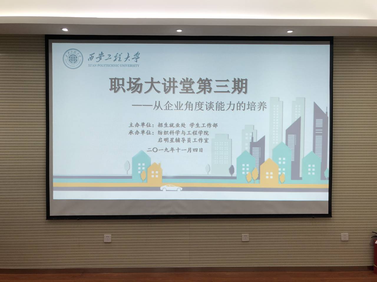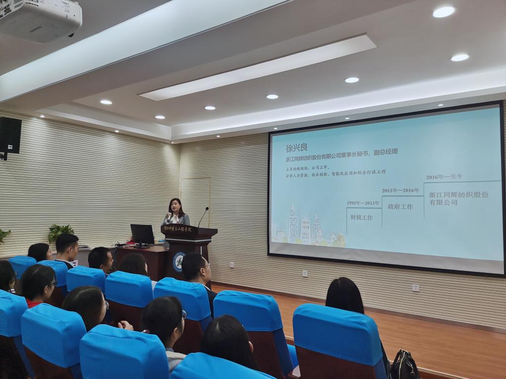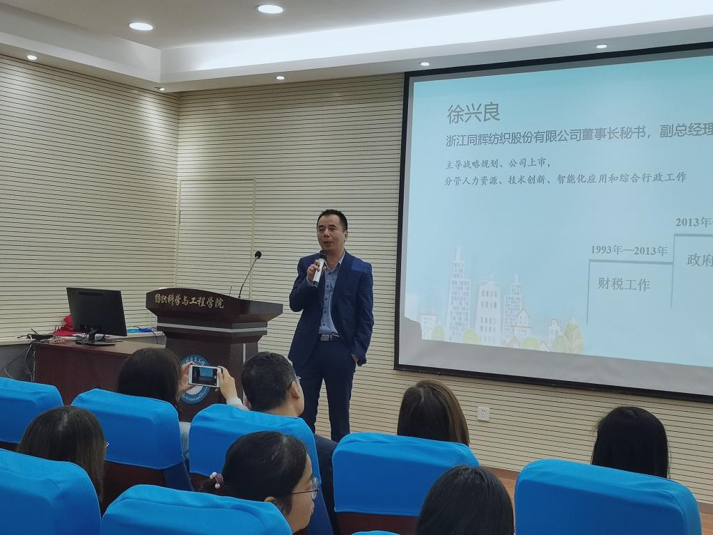 2019年11月4日,纺织科学与工程学院在金花校区姚穆报告厅举办“从企业角度谈大学生能力培养”专题讲座。本次活动是学校招生就业处、学生工作部(处)主办,启明星辅导员工作室承办的品牌活动职场大讲堂第三期,特别邀请了浙江同辉纺织股份有限公司副总经理徐兴良为大三学生作专题讲座,纺织科学与工程学院党委副书记郭西平、学生工作办公室主任赵勇进、团总支书记付成程及2017级全体学生参加了讲座。讲座由启明星辅导员工作室主持人高黎主持。