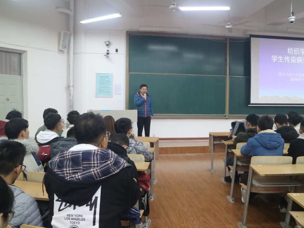 2019年11月27日,纺织科学与工程学院在临潼校区B-137教室举行2019级新生入学教育讲座之卫生防疫宣讲。校医院杨军宏大夫担任主讲人,2019级全体学生参加了宣讲会。