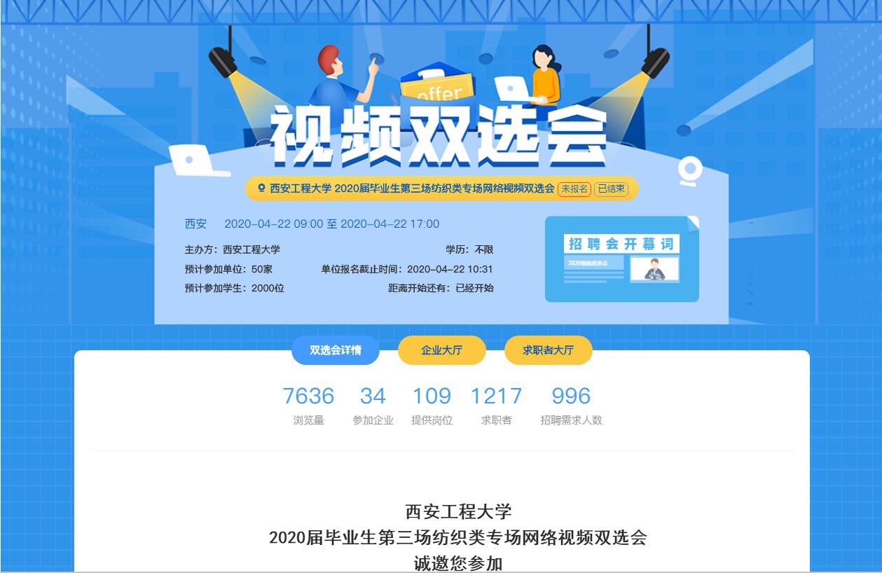 4月22日,俄罗斯294专享会举办2020年春季毕业生第三场纺织类视频双选会,本次双选会由招生就业处主办,纺织科学与工程学院承办。来自全国各地34家纺织类企业报名参会,提供岗位109个,提供岗位需求人数996人次。在线浏览量7585次。双选会涉及332所高校毕业生参会,参会毕业生1217人,其中我校毕业生参会228人。用人单位有意向人数90人。
