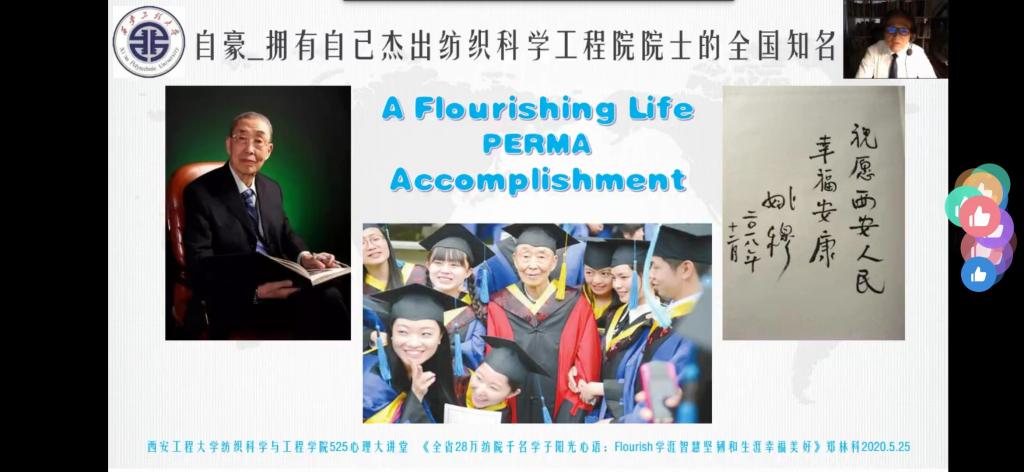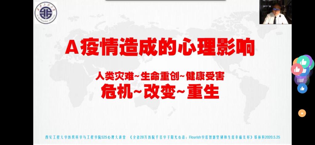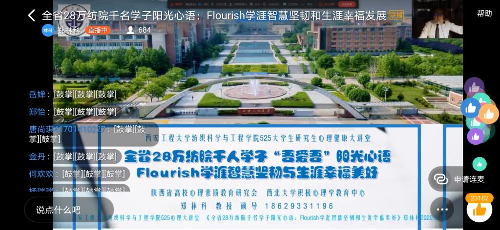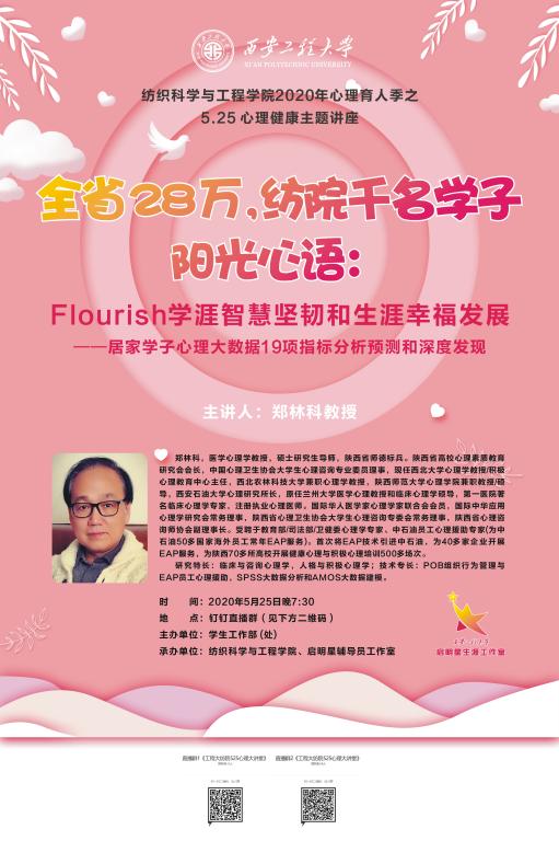 2020年5月25日,由我校学生工作部(处)主办,纺织科学与工程学院、启明星辅导员工作室承办的5.25线上心理健康主题讲座成功举办,本次讲座邀请医学心理学教授、陕西省师德标兵郑林科教授作题为《Flourish学涯智慧坚韧和生涯幸福美好》的讲座,讲座在钉钉群直播进行,共有1069名师生收看了本场讲座。