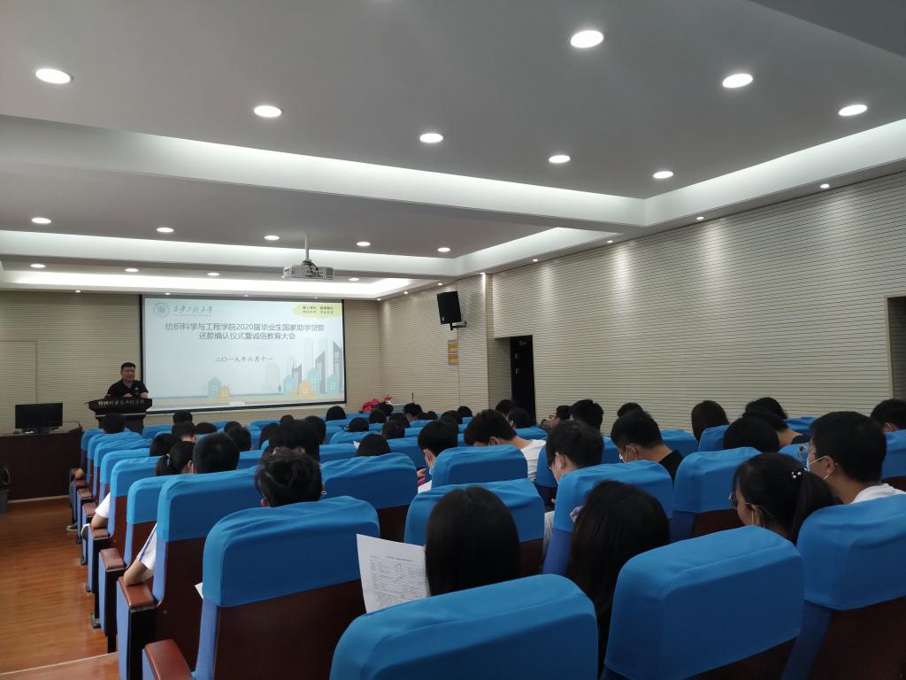 2020年6月11日,纺织科学与工程学院在金花校区姚穆报告厅举办2020届毕业生生源地贷款还款确认仪式暨诚信教育大会,大会由学院资助辅导员邓恩征主持,学院2020届全体生源地贷款本科生参加了大会。