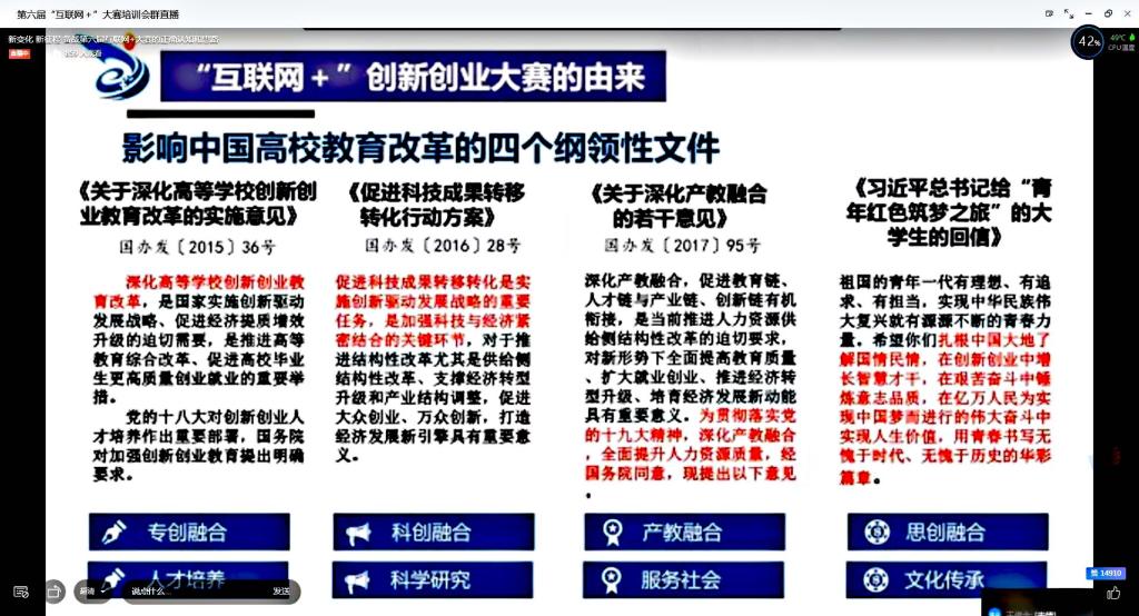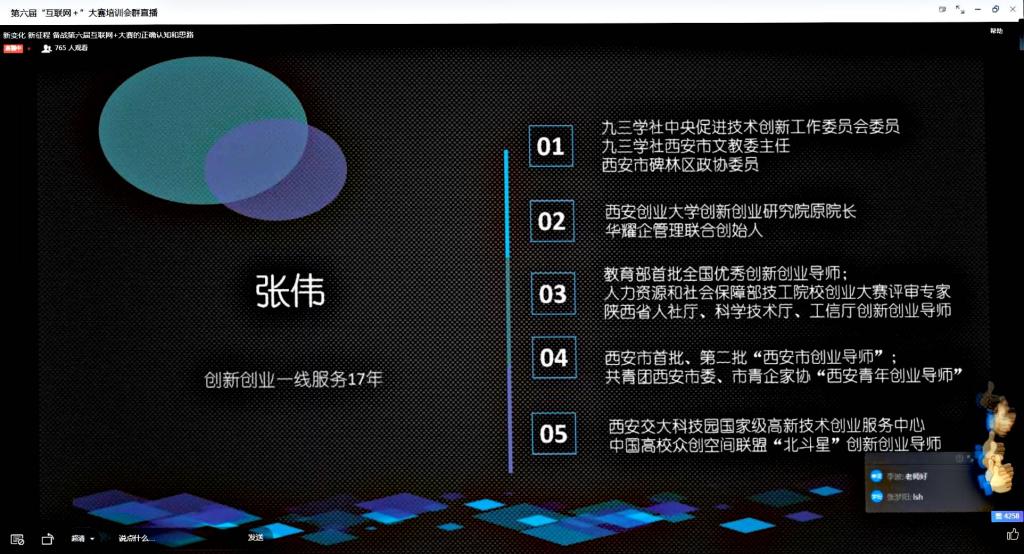 为进一步做好我校第六届中国国际“互联网+”大学生创新创业大赛的备赛工作,切实提升我校参赛项目的质量和水平,提升指导教师和学生团队创新创业能力,使参训人员了解更多创新创业竞赛常识,进一步增强创新创业教育的科学性和实效性。2020年6月24日,我校举办第六届中国国际“互联网+”大学生创新创业大赛线上培训,会议邀请教育部首批创新创业指导师张伟进行线上培训指导。本次会议由教务处主办,纺织科学与工程学院三全育人导师团承办。会议由纺织科学与工程学院党委副书记郭西平主持,各学院1000余名学生参加培训会。