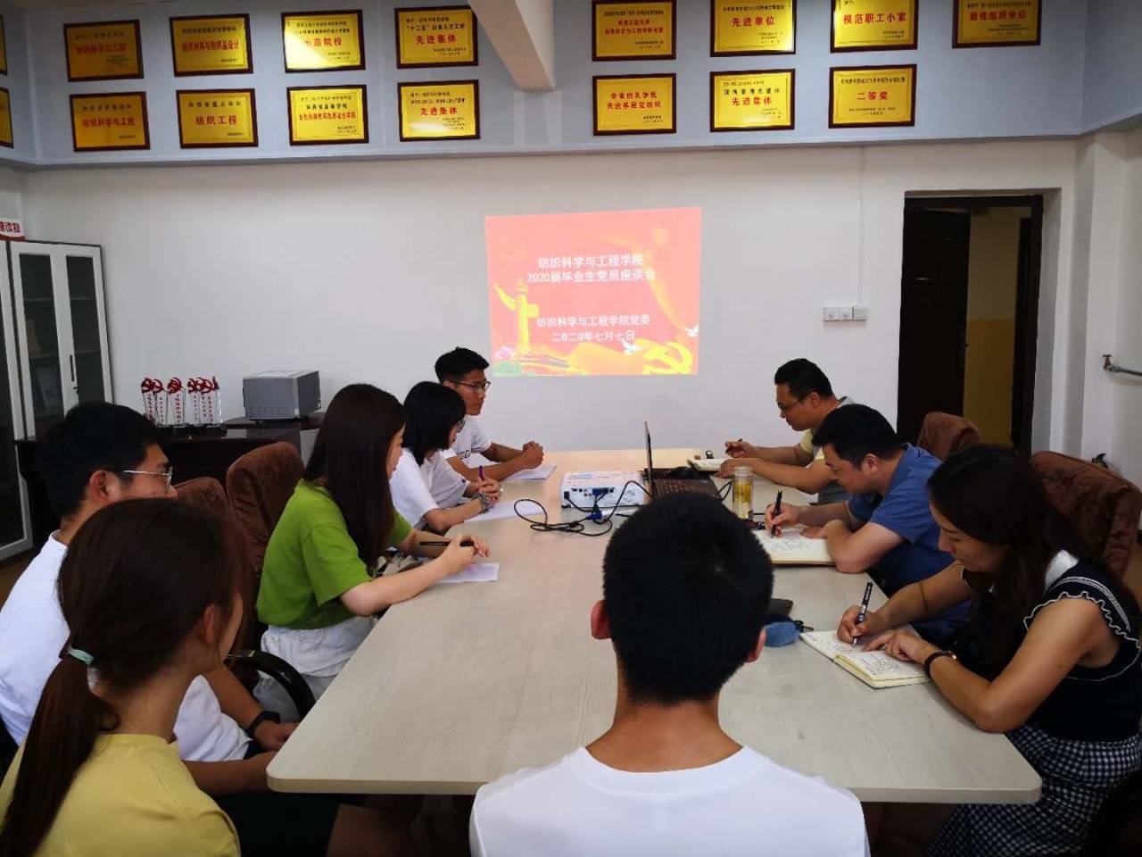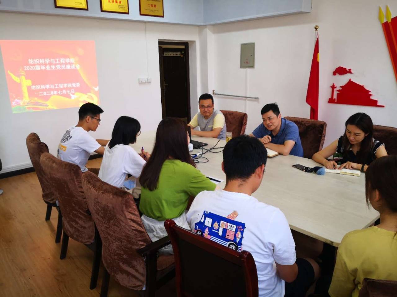 根据纺织科学与工程学院党委庆祝建党99周年系列活动安排,2020年7月7日,纺织科学与工程学院党委在金花校区纺织楼党建活动室召开2020届毕业生党员代表座谈会。学院党委书记胡小进、副书记郭西平、党委委员赵勇进及2020届研究生、本科生党员代表参加了座谈会,会议由胡小进主持。