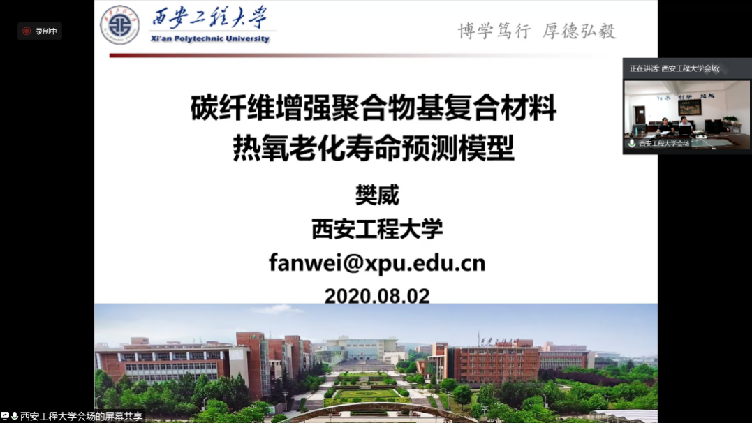 8月2日,会议围绕纺织力学模型和纳米纤维材料主题,我校纺织科学与工程学院樊威副教授、窦皓副教授、西安建筑科技大学的田丹博士等分别作了题为《碳纤维增强聚合物基复合材料热老氧化寿命预测模型》《纳米纤维纱制备的最新研究进展》和《蜘蛛纺丝的数学原理与纳米材料在建筑工程中的应用》的学术报告,对纺织中的数学问题进行了阐述,并结合实际案例讲解了如何就纺织中的实际问题进行数学建模。