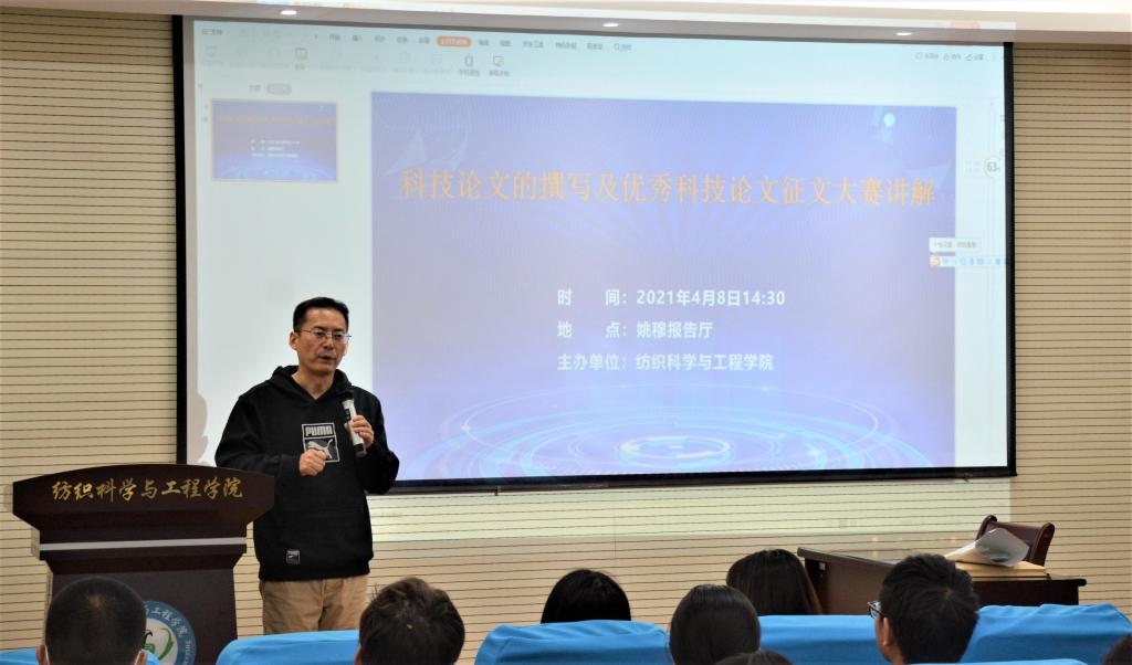 2021年4月8日,纺织科学与工程学院在金花校区姚穆报告厅举办“科技论文的撰写及优秀科技论文征文大赛讲解”讲座。学院党委书记李伟、副书记郭西平、学报编辑部主任武晖及2019级、2020级研究生参加活动,活动由研究生辅导员付成程主持。