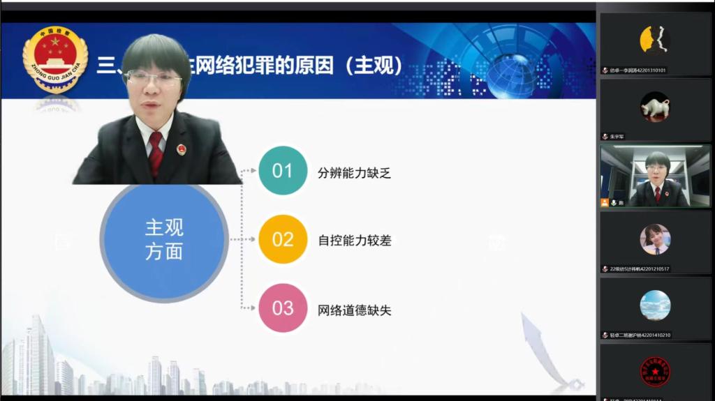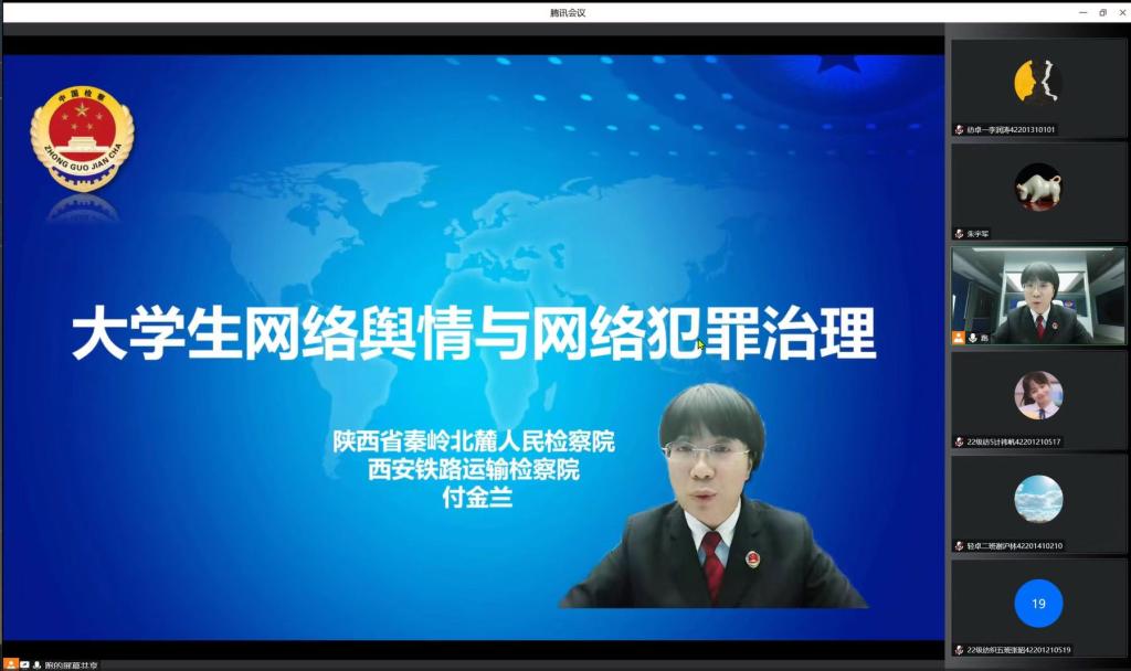 为深化大学生对网络舆情与犯罪的认识,引导学生正确对待网络。2022年11月9日,纺织科学与工程学院邀请陕西省北麓地区人民检察院检委会专职委员付金兰在线上作题为“大学生网络舆情与网络犯罪的治理”的讲座。学院党委副书记朱宇军、各年级辅导员、2022级全体学生和二、三、四年级学生代表参加了此次讲座。