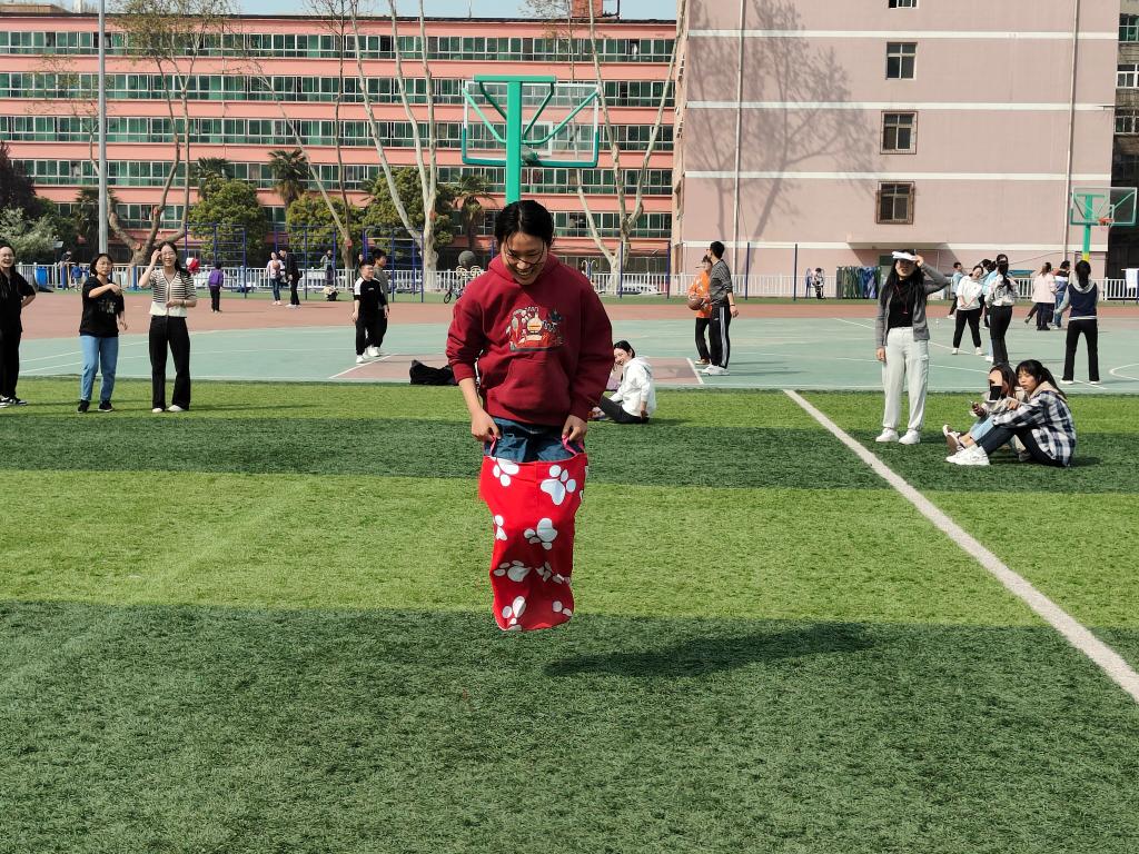 活动伊始,主持人介绍了此次活动的流程、比赛项目以及注意事项。同时各队排出代表分组抽签,并宣布队名和口号。参赛队员们摩拳擦掌,跃跃欲试。本次趣味运动会共设置了“袋鼠跳”“跳长绳”“乒乓球拍托球跑”“四人五足”和“定点投篮”五个项目。每个项目都考验了运动员的耐力、反应力及协作能力,在注重体育运动竞技性的同时,更加注重趣味性和娱乐性,让同学们真正在运动中收获快乐,在快乐中尽情运动。赛场上,参赛选手激情洋溢,相互协作,加油声和笑声此起彼伏,整个比赛充满了轻松欢乐的气氛。