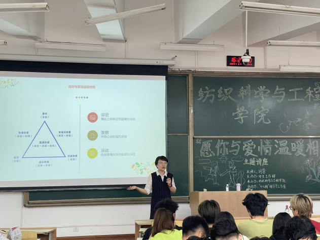 为了更好地引导学生正确恋爱观的形成,帮助学生解决在恋爱过程中产生的部分问题。纺织科学与工程学院于2023年6月1日开展“愿你与爱情温暖相拥”主题讲座,本次讲座特邀俄罗斯294专享会大学生心理健康教育与咨询中心主任刘蓉担任主讲,学院21级辅导员刘要及21级全体学生一起聆听了报告。