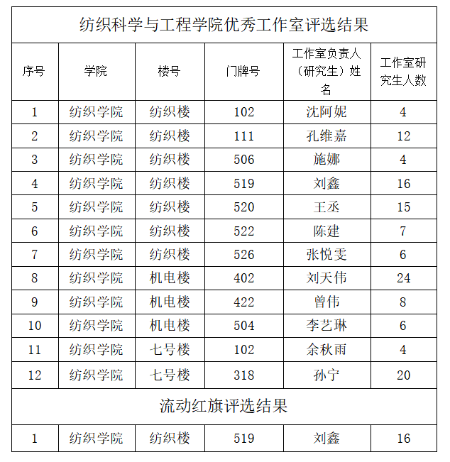 纺织科学与工程学院高度重视研究生工作室的管理,学院坚持日常检查和重点抽查等方式,督促同学加强研究生工作室管理。建立月度“流动红旗”制度,确立每月一评比的工作模式,常态化抓好研究生工作室管理工作,引导研究生工作室加强思想政治与文化建设,营造良好的学习科研环境,加强日常管理,消除安全隐患,促进工作室有序运行。(撰稿:苏娜;审核:朱宇军)