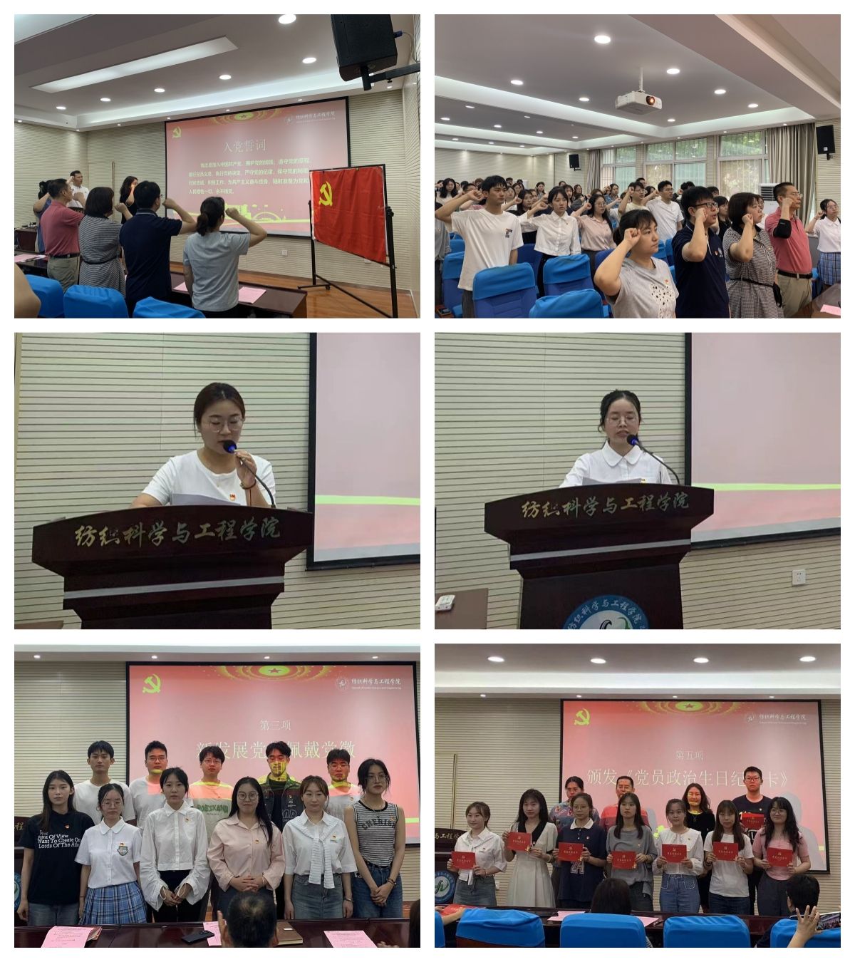 仪式在激昂的《国际歌》中拉开帷幕。首先,朱宇军宣读了参加宣誓的新党员名单,辅导员苏娜和刘要为新发展党员代表佩戴了党徽。接着,郭西平同志带领全体党员面向鲜红的党旗进行了庄严的宣誓,新党员进行入党宣誓,老党员重温入党誓词。大家右手握拳、挺胸抬头、目光坚毅、声声铿锵。紧接着李伟和郭西平为新发展党员颁发了党员政治生日纪念卡。纪念卡不仅是一份荣誉的象征,更是对党员们不忘初心,牢记党员使命的鞭策和激励。