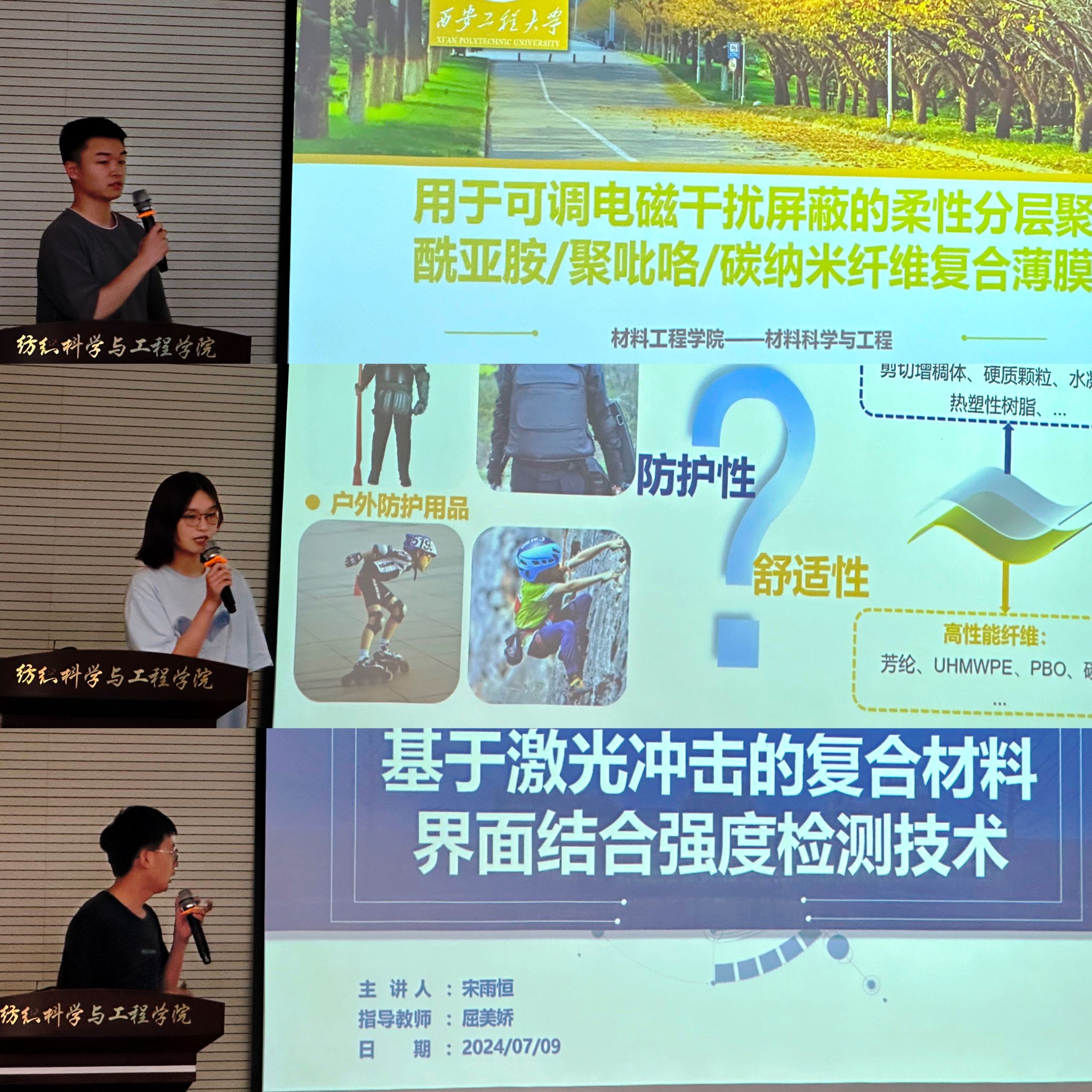 随后,3位获奖学生分别作学术交流分享。纺织学院张晓彤作题为《用于个人防护装备的仿生智能化柔性Kevlar/水凝胶复合材料》的报告,机电学院宋雨恒作题为《基于激光冲击的复合材料界面结合强度检测技术》的报告,材料工程学院获奖学生代表李辉作题为《用于可调电磁干扰屏蔽的柔性分层聚酰亚胺/聚吡咯/碳纳米纤维复合薄膜》的报告。3位学生代表的分享紧密围绕纤维、织物、服装等核心领域,深入探索了仿生智能化材料、复合材料检测技术以及可调电磁干扰屏蔽材料等前沿科技,展现了各自的科研实力和创新精神。