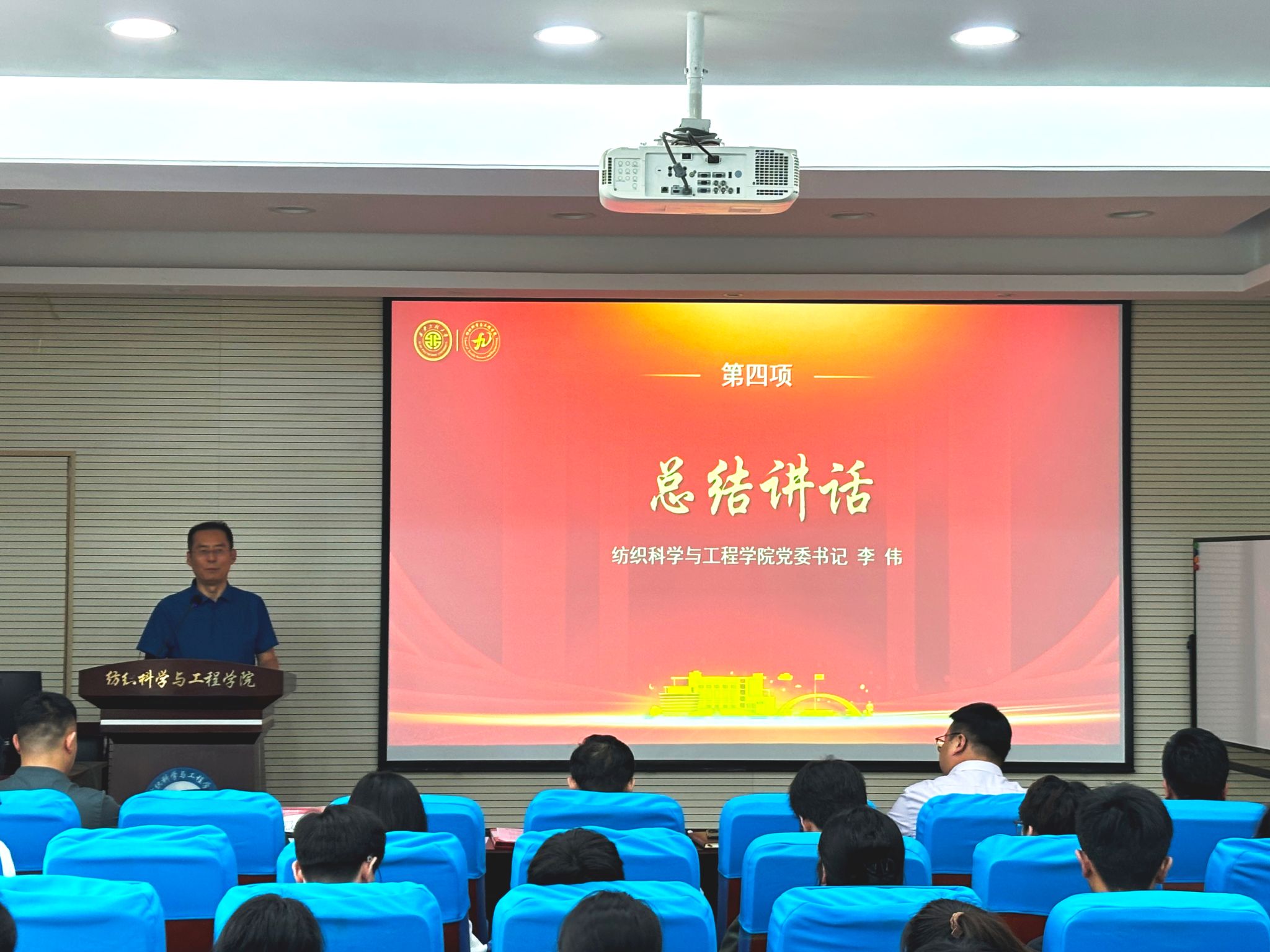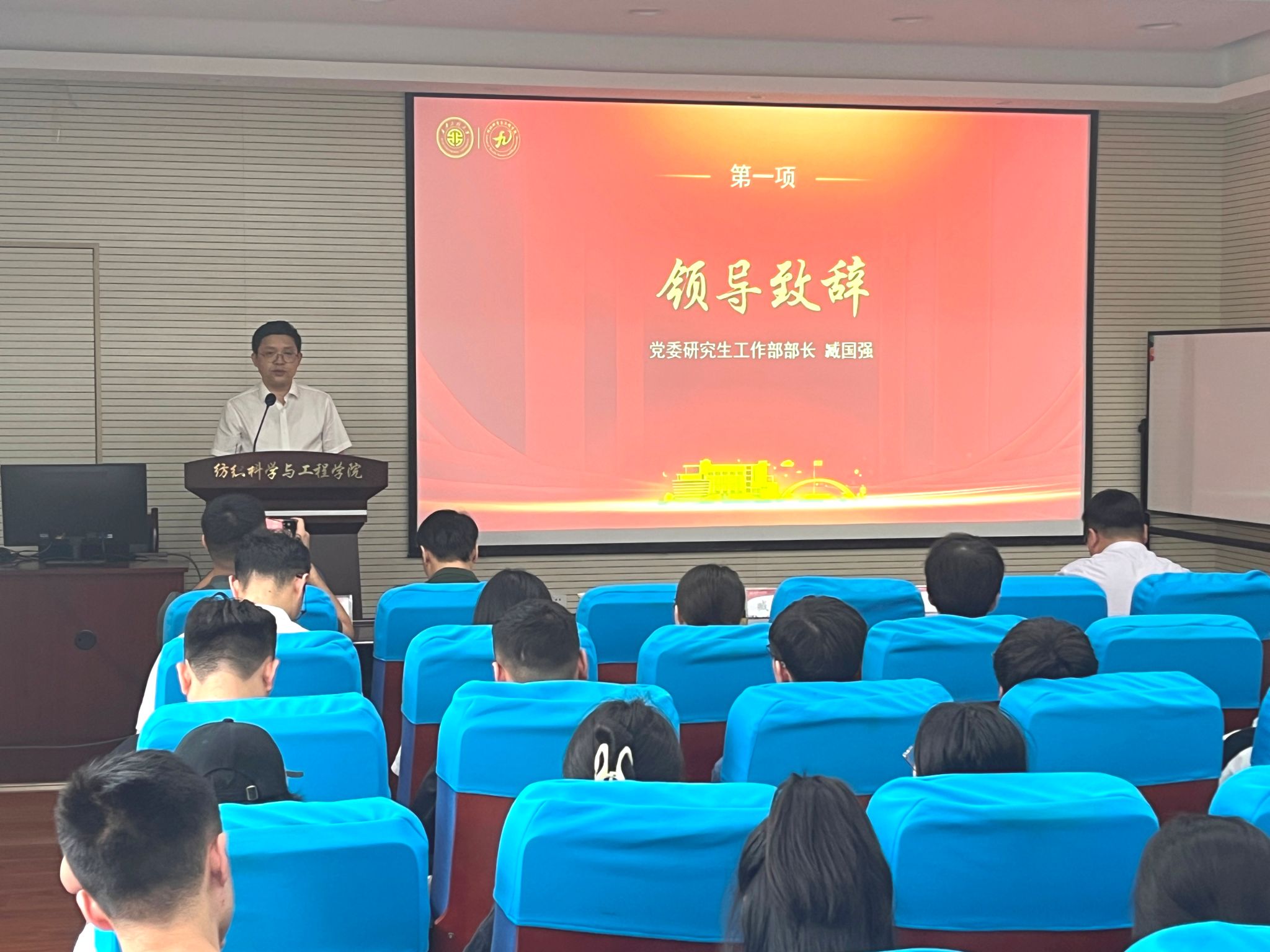 校党委研究生工作部部长臧国强、机电工程学院党委副书记冯翊、服装与艺术设计学院党委副书记马磊、环境与化学工程学院团委书记贾天昱、材料工程学院研究生辅导员侯润泽,纺织学院党委书记李伟老师、院长助理王秋实、纺织学院辅导员及各学院研究生代表共70余人参加活动,活动由纺织学院党委副书记朱宇军主持。