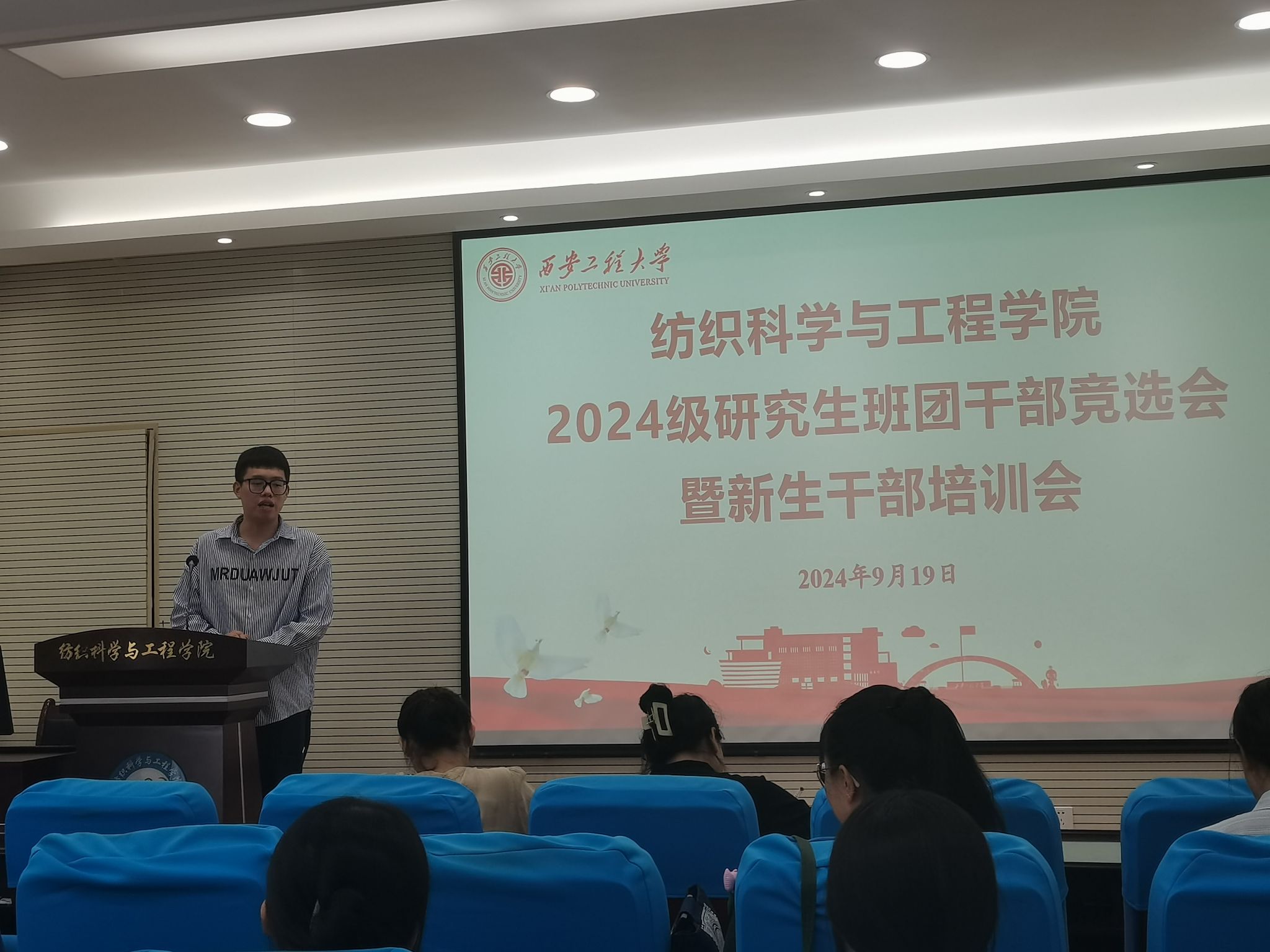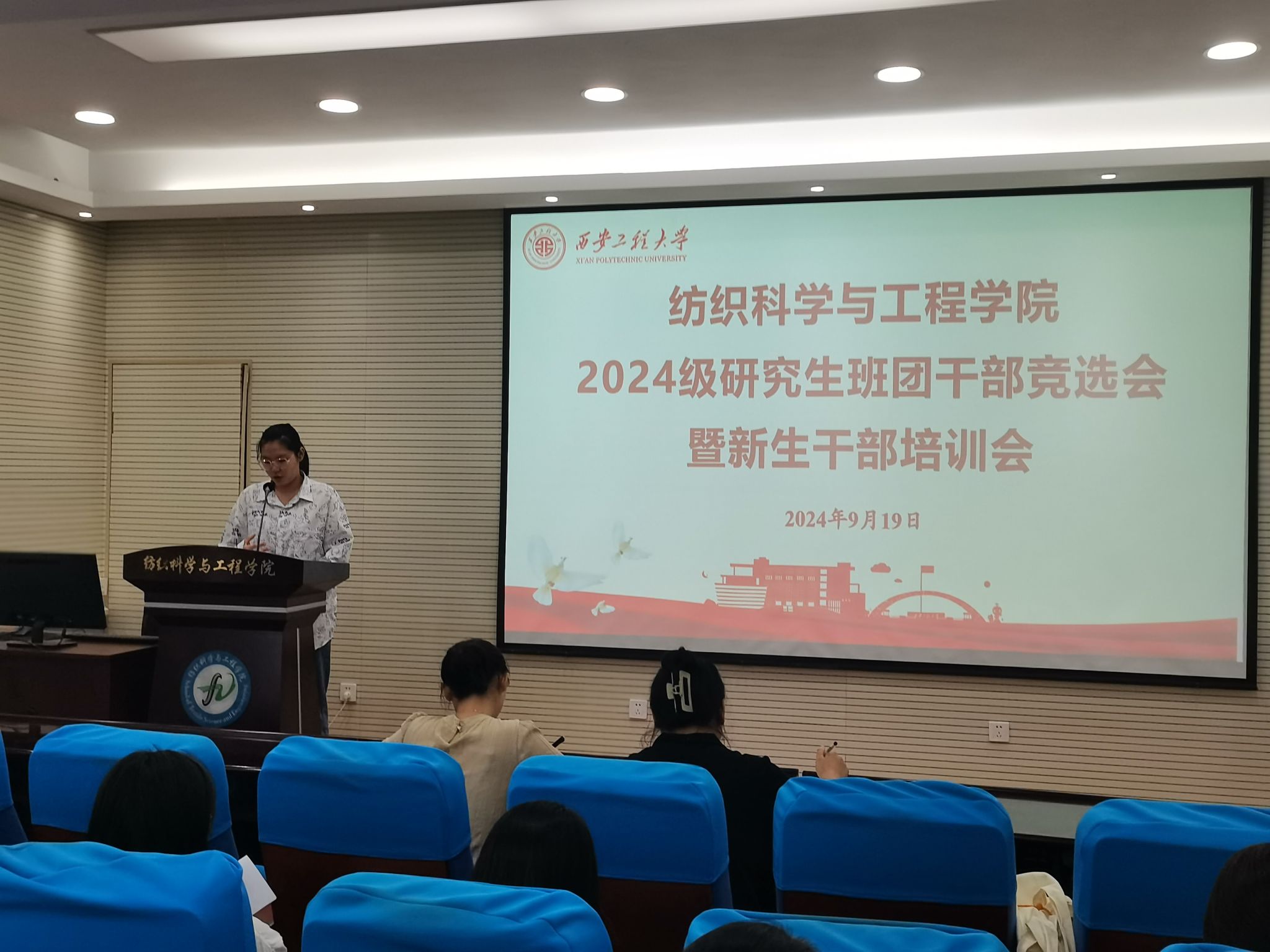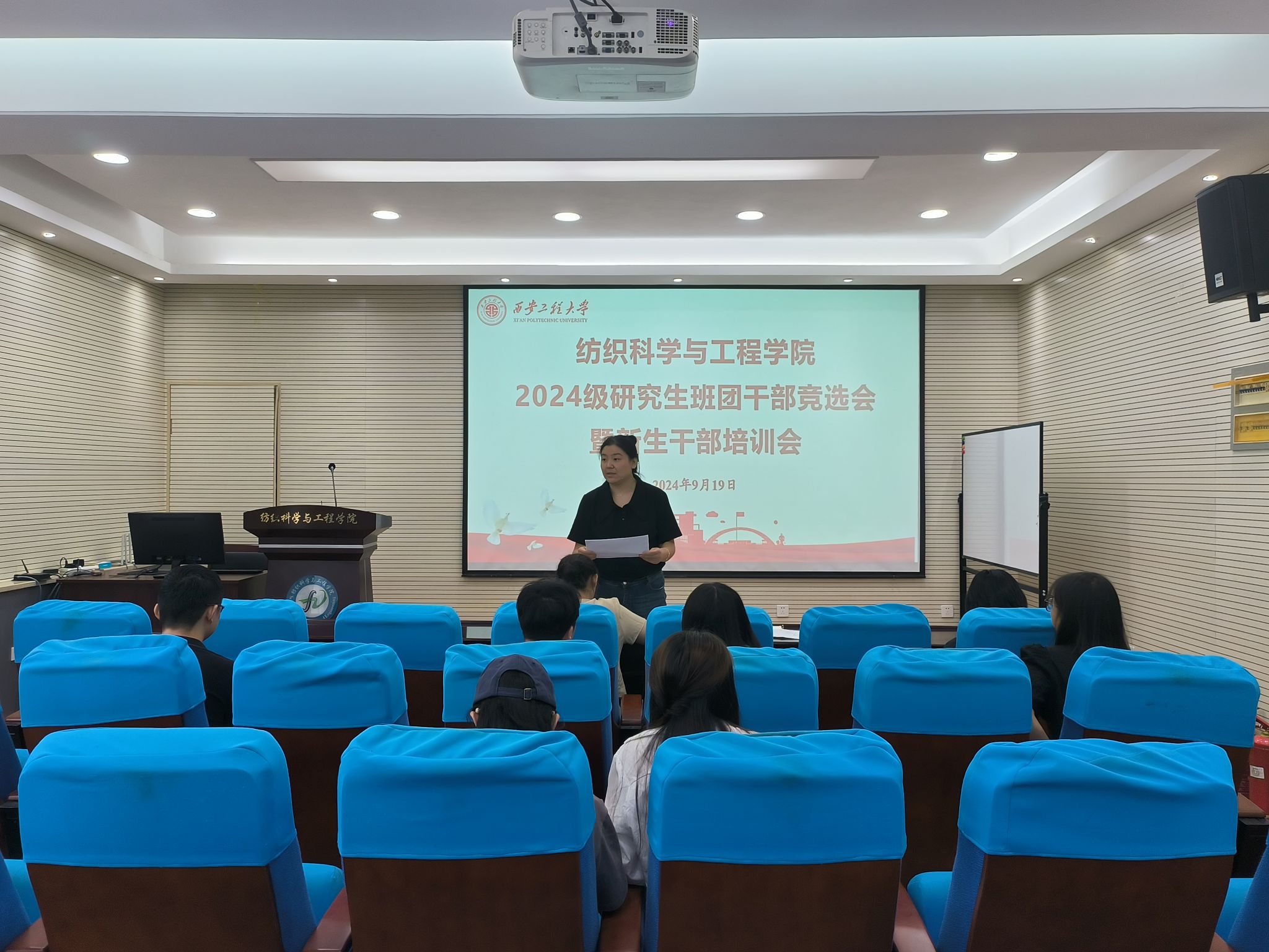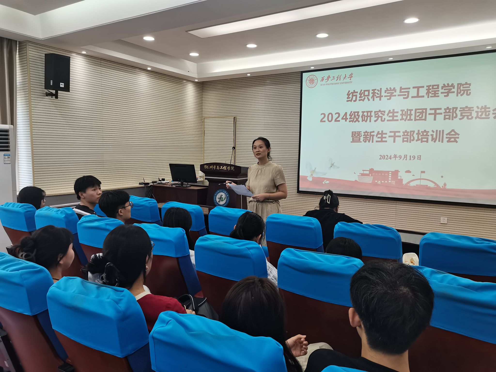 2024年9月19日,纺织科学与工程学院在金花校区纺织楼二楼姚穆报告厅举办2024级研究生班团干部竞选会暨新生干部培训会,学院学生工作办公室主任姚婕、博士研究生辅导员苏娜和2024级研究生参加了会议,会议由姚婕主持。