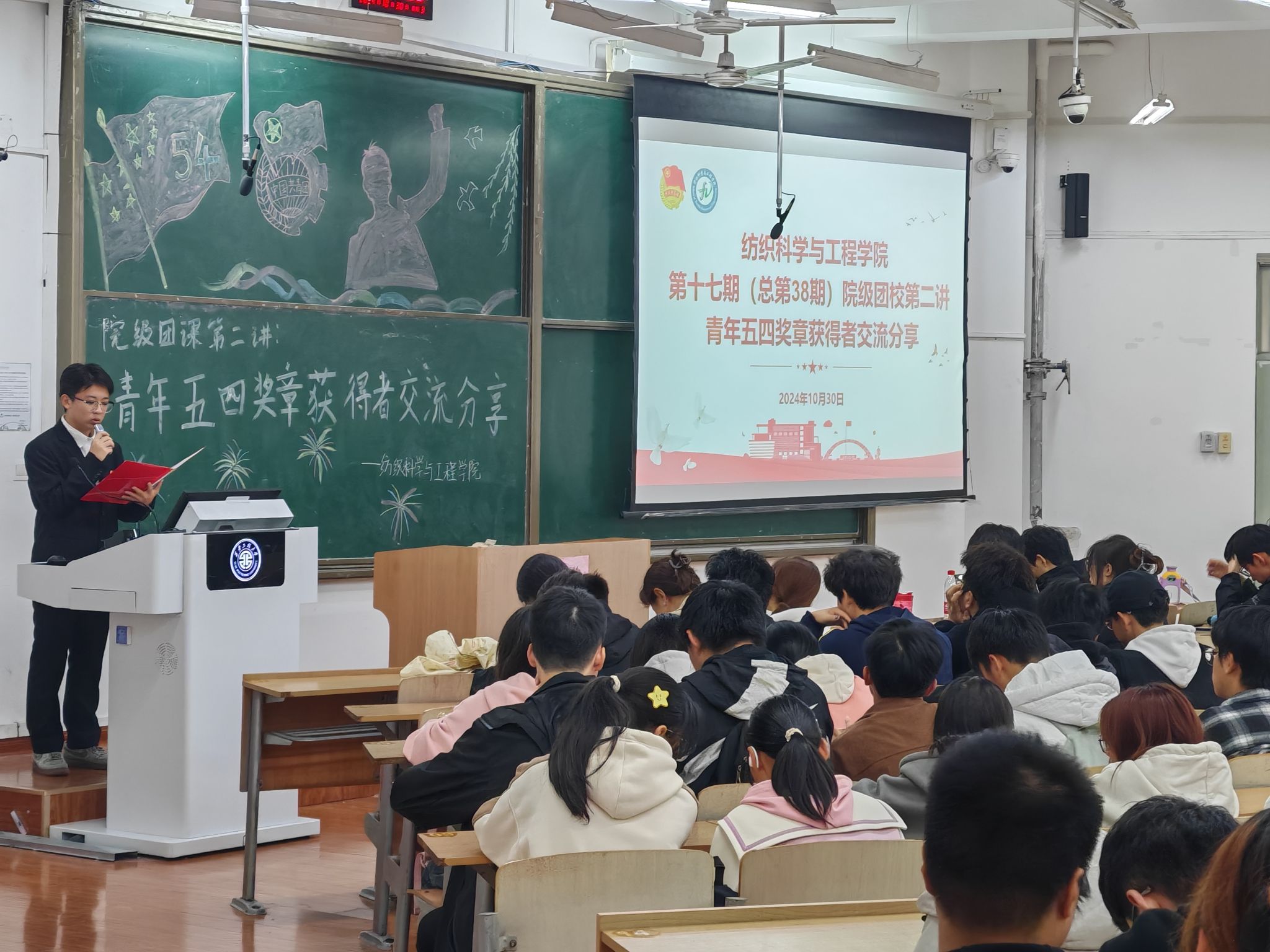 为进一步学习贯彻习近平总书记关于青年工作的重要论述,引领青年肩负起为中国式现代化挺膺担当的青春责任。10月30日,纺织科学与工程学院邀请2023-2024学年青年五四奖章获得者学院2024级研究生杨忠凯和2021级本科生范大程在临潼校区与学院2024级全体本科新生开展交流分享活动。