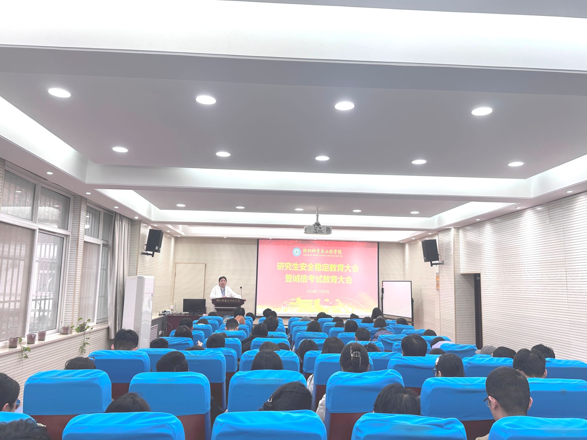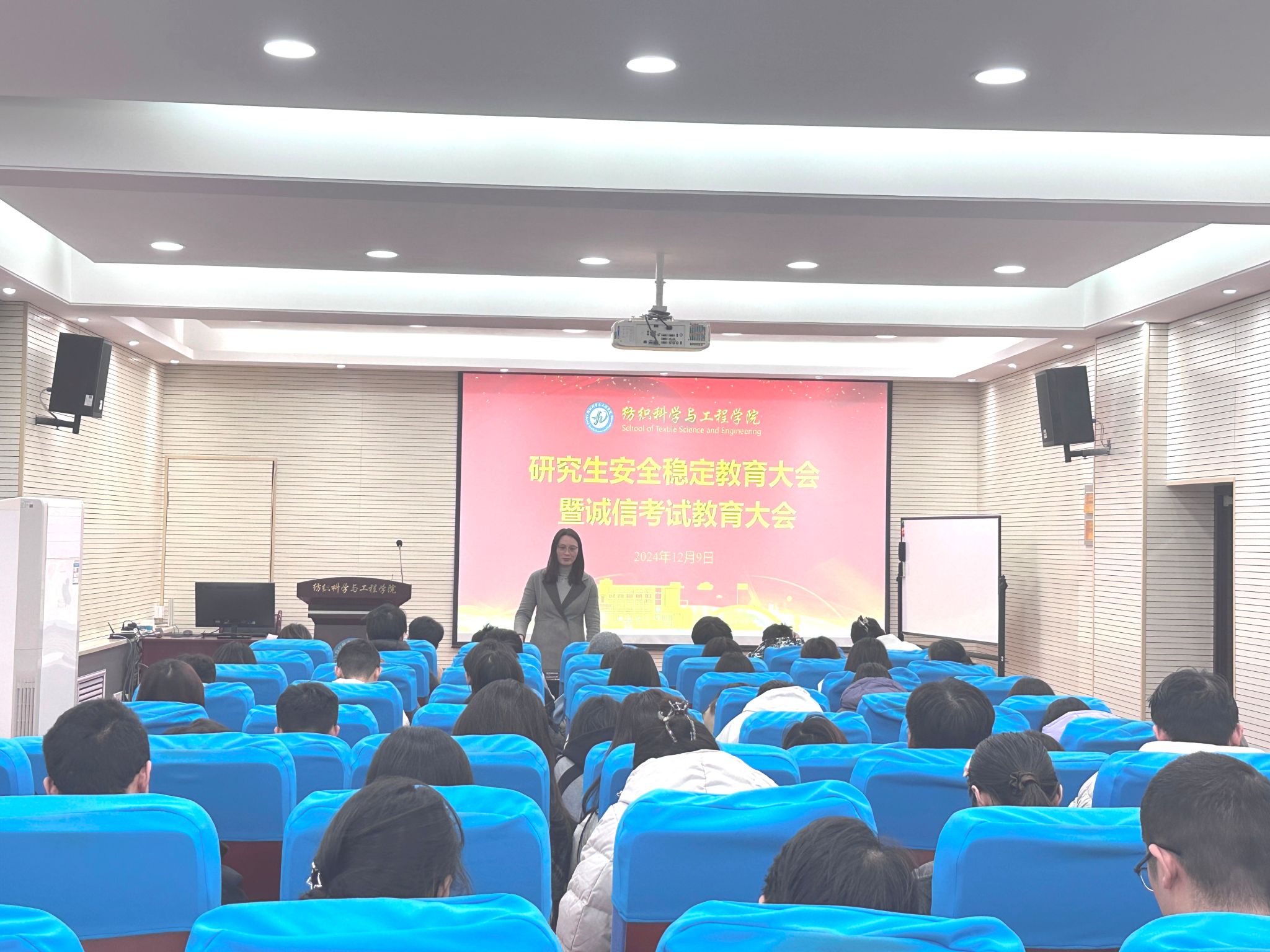 为切实加强研究生安全稳定教育工作,强化研究生诚信考试意识,12月9日下午,纺织科学与工程学院在金花校区纺织楼姚穆报告厅召开研究生安全稳定教育大会暨诚信考试教育大会,学院学工办主任、研究生辅导员姚婕,研究生辅导员苏娜和全体硕博研究生班长、团支书以及宿舍长参加了会议,会议由姚婕主持。
