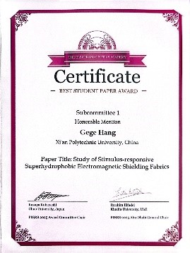 博士生杭格格以“Study of Stimulus-Responsive Superhydrophobic Electromagnetic Shielding Fabrics”为题进行了口头报告,分享了她在“智能+电磁屏蔽”复合功能纺织品领域的最新研究成果,并阐述了个人见解。凭借出色的表现,她从众多研究生中脱颖而出,荣获最佳学生论文优秀奖。博士生王亚静则以“Design and Fabrication of a Flexible Metamaterial Absorber based on Fabric”为题,向与会者展示了其在“吸波+屏蔽”电磁超材料领域的最新研究进展。这些成果吸引了众多学者的目光,包括白俄罗斯国立大学核问题物理技术实验室主任Dzmitry Bychanok在内的多名专家教授与两位博士生展开了深入的讨论与交流。