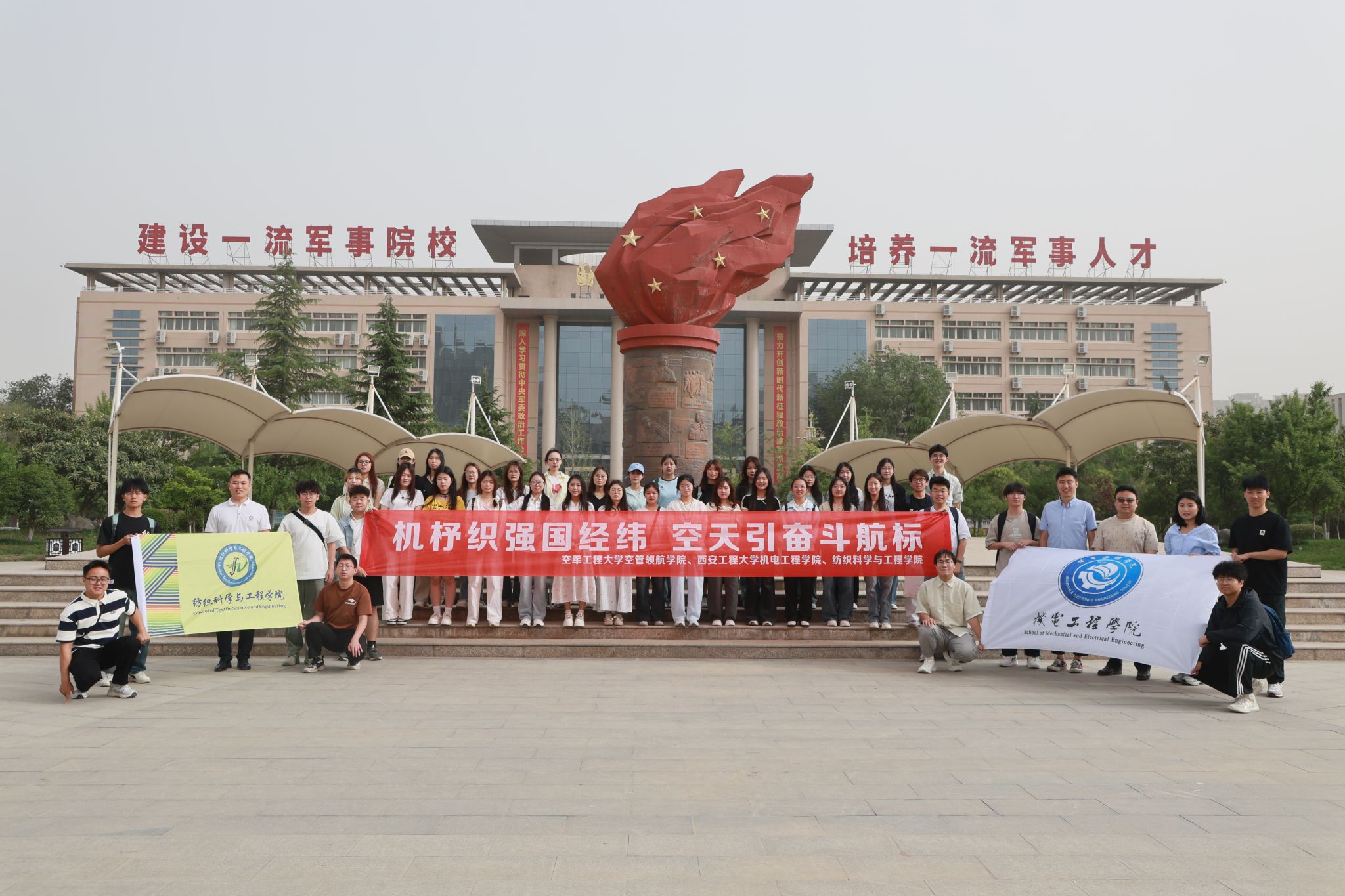 在五四青年节的热烈余韵中,5月17日,我校纺织科学与工程学院团委与机电工程学院团委联合组织校青马班学员代表及部分团员青年共40余人,赴空军工程大学空管领航学院开展“机杼织强国经纬・空天引奋斗航标”主题团日活动。机电学院党委副书记冯翊、团委书记刘鹏、辅导员郭方义,纺织学院团委书记曹鑫参加此次活动,这场跨越军地界限的青春对话,在初夏的晴空下激荡出强国强军的时代强音。