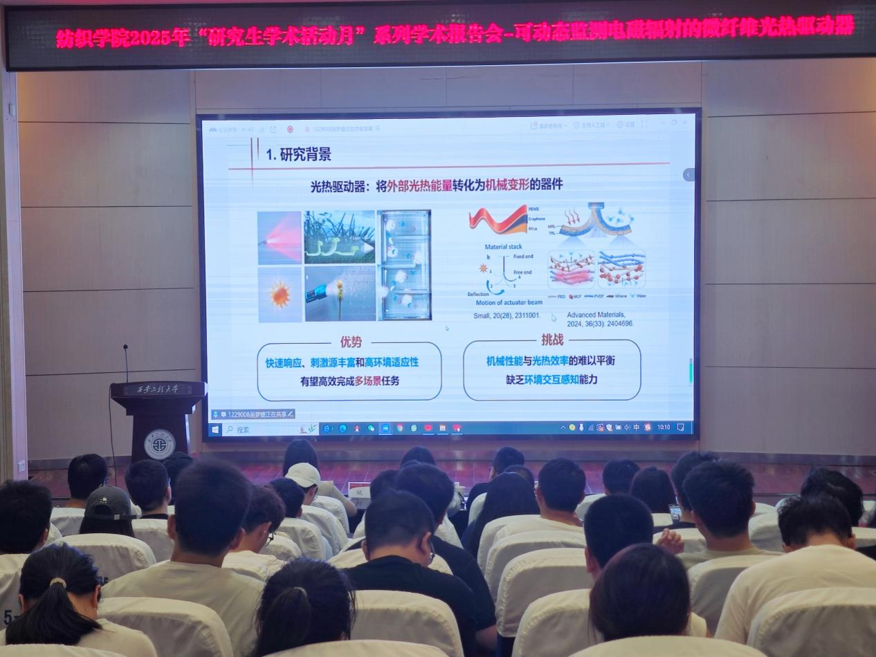 为深入交流学术前沿成果,拓展研究生学术视野,加强校际交流合作,2025年5月21日,纺织科学与工程学院邀请学院优秀校友、东华大学博士研究生吴梦婕,在金花校区图书馆一层西纺报告厅成功举办2025年“研究生学术活动月”系列活动之“可动态监测电磁辐射的微纤维光热驱动器”学术报告会。学院党委副书记朱宇军、院长助理王秋实、研究生辅导员姚婕和2022级、2023级研究生150余人参加了报告会,本次报告会由王秋实主持。