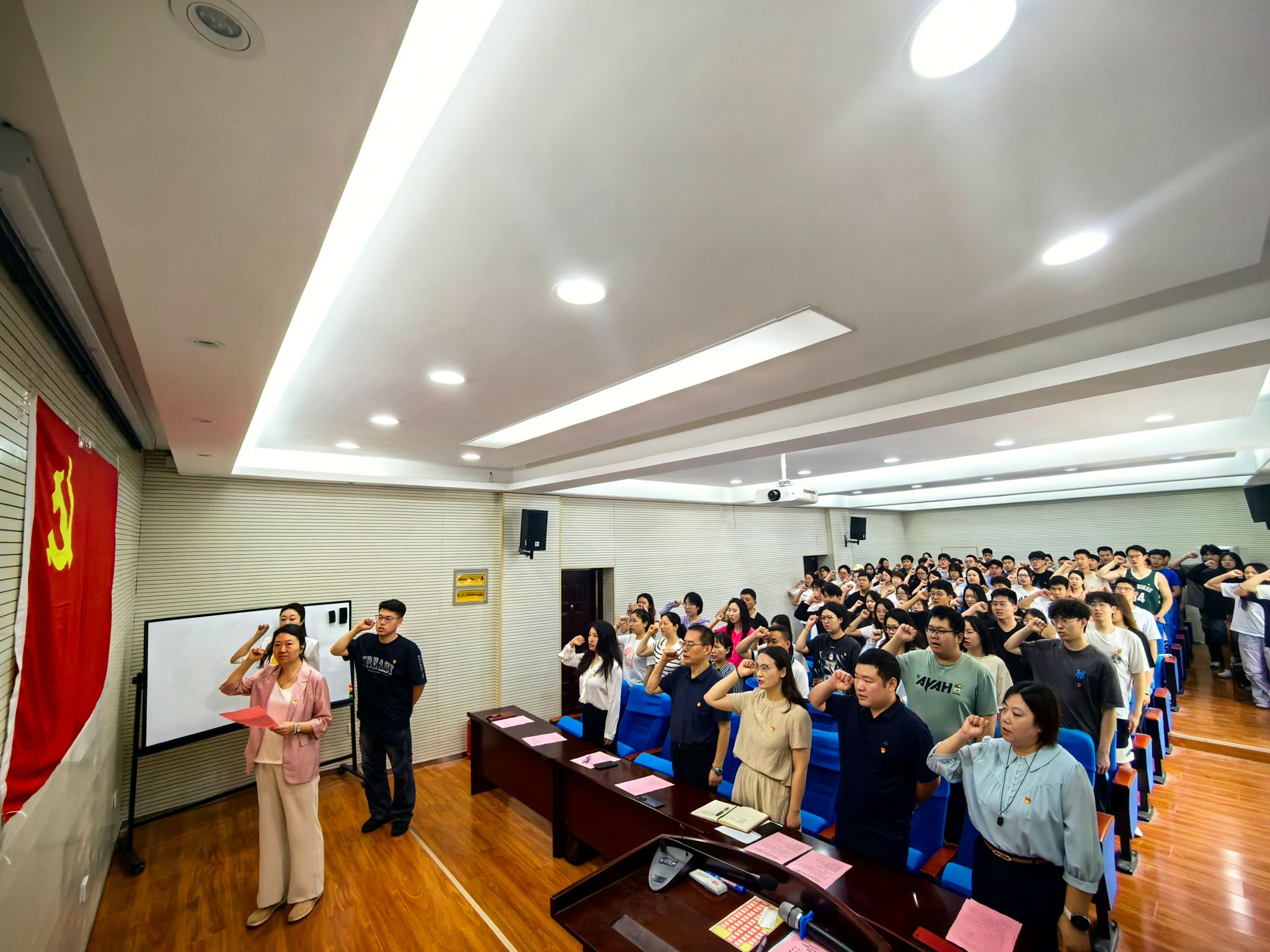 活动在庄严的《国际歌》中拉开帷幕。学院学工办主任姚婕宣读新党员名单,支部委员为新党员代表佩戴党徽,刘蔓茹同志领誓,新发展党员面向党旗郑重宣誓,老党员集体重温入党誓词。简洁庄重的仪式进一步强化了党员身份意识和政治责任感。