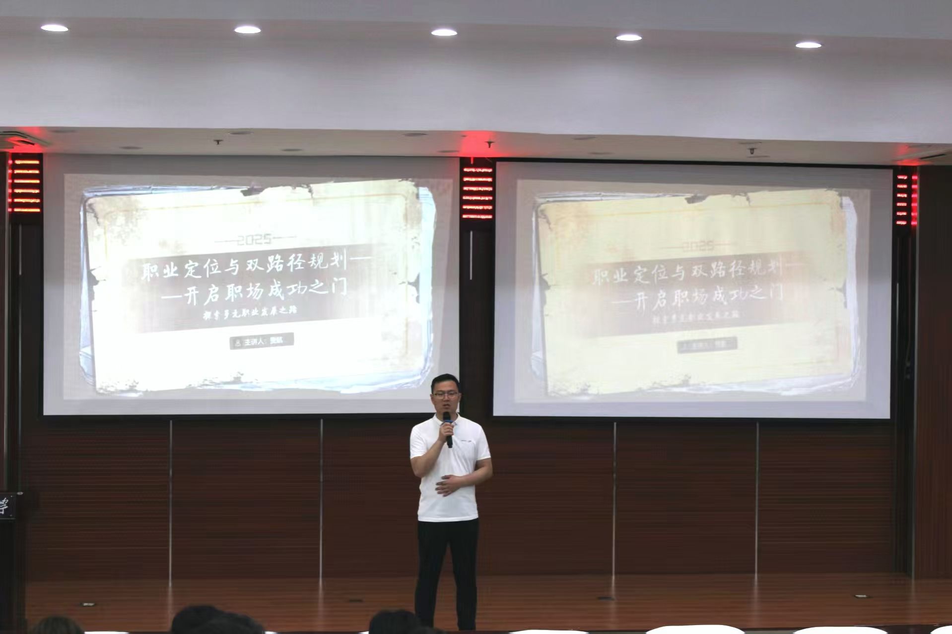 贾航以“职业定位与双路径规划——开启职场成功之门”为主题展开深度分享。他从职业思考切入,引导学生跳出“唯薪资论”,立足个人长期价值实现,锚定职业方向。在职业定位的重要性上,贾航强调精准定位是提升职场不可替代性的关键。针对学生普遍关注的“就业与读研”抉择难题,他分析了不同路径的适配人群:一部分人群倾向读研深造,另一部分则适合优先就业积累经验。针对如何高质量就业,他不仅解读了名企应聘、体制内备考、创新创业等多元赛道,还分享了诸多求职技巧。此过程中,同学们与主讲人积极互动,营造了良好的交流氛围。