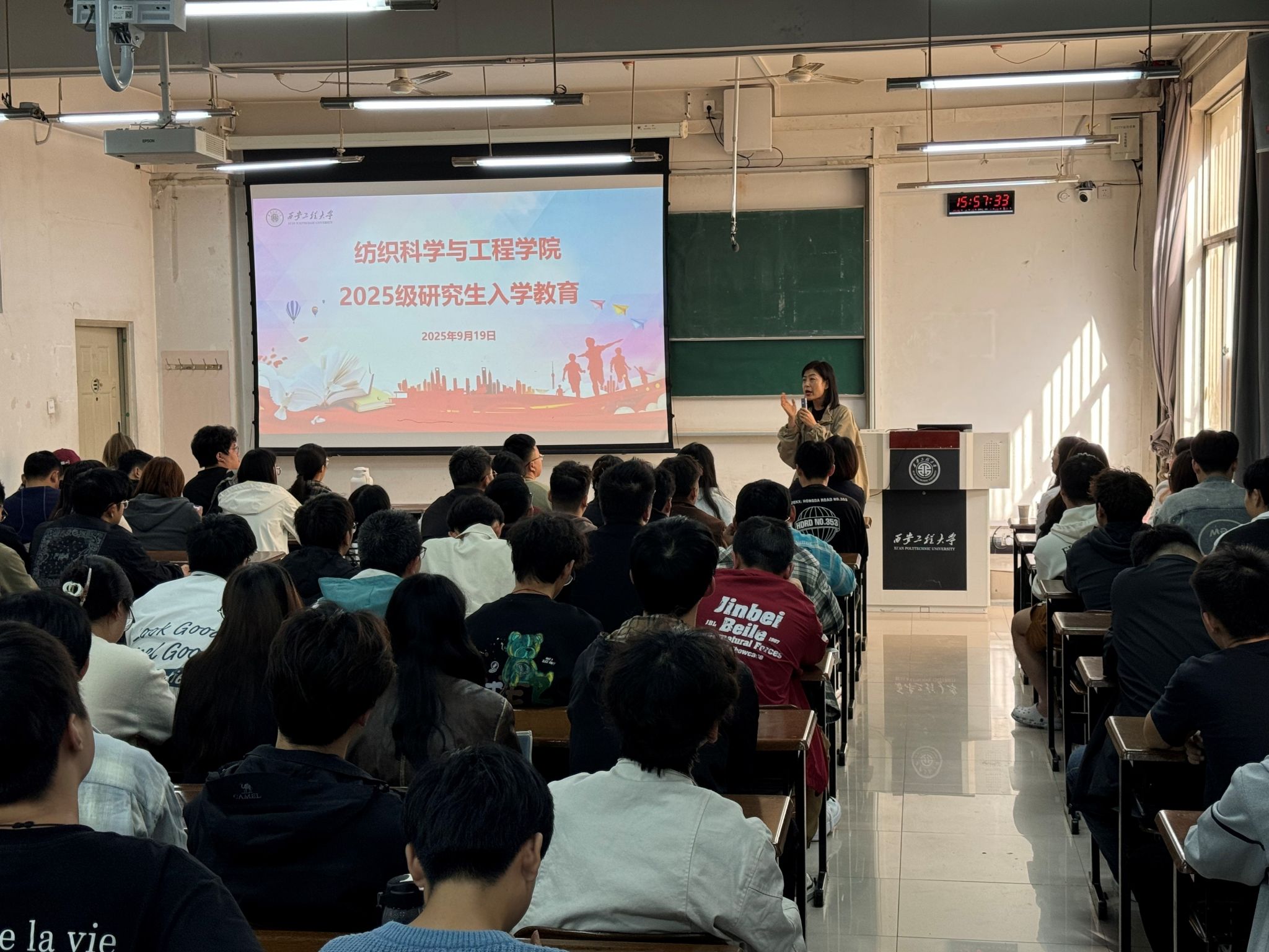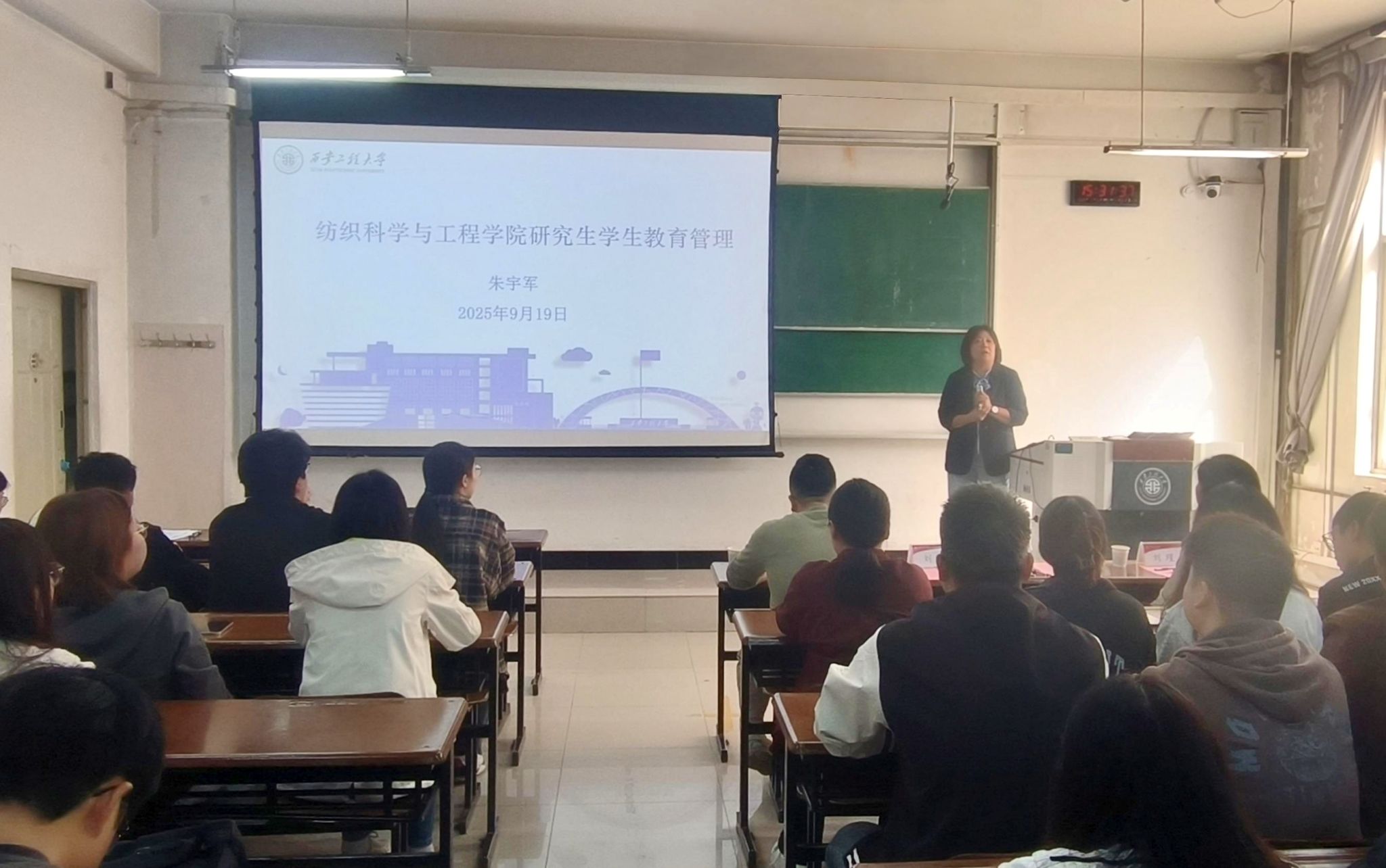 2025年9月19日下午,纺织科学与工程学院在金花校区8号教学楼415教室举办2025级研究生入学教育大会。学院副院长(主持日常工作)刘哲、党委副书记朱宇军、院长助理王秋实、研究生秘书刘瑾姝、博士研究生辅导员苏娜以及2025 级全体硕博研究生参加了大会,会议由学院学生工作办公室主任兼硕士研究生辅导员姚婕主持。