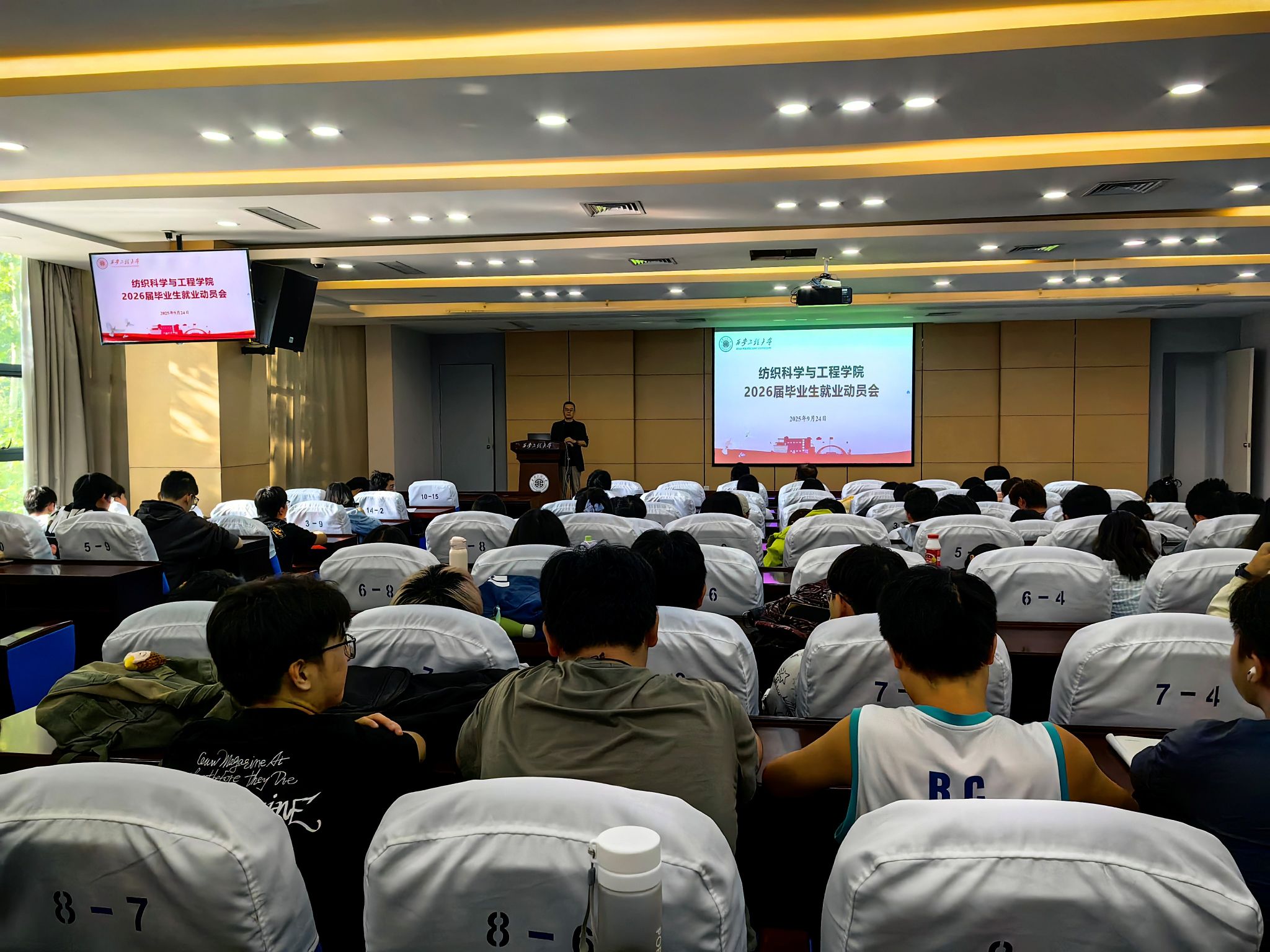 为进一步做好2026届毕业生就业工作,帮助同学们明确目标、科学规划未来,9月24日,纺织科学与工程学院在金花校区召开2026届毕业生就业动员大会。学院党委书记李伟,副院长刘哲,党委副书记朱宇军,院长助理王秋实,以及毕业班辅导员邓恩征出席会议,2026届全体本科毕业生参加大会。