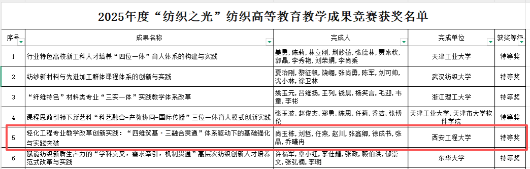 纺织科学与工程学院教师在2025年度“纺织之光”纺织高等教育教学成果竞赛中获佳绩