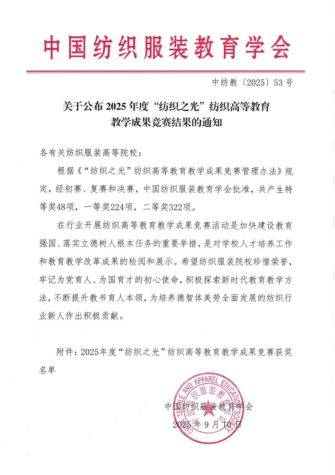 近日,中国纺织服装教育学会发布《关于公布 2025 年度 “纺织之光” 纺织高等教育教学成果竞赛结果的通知》(中纺教〔2025〕53 号)。纺织科学与工程学院获教学成果特等奖1项、二等奖2项。其中,由尚玉栋等老师完成的《轻化工程专业教学改革创新实践:“四维筑基・三融合贯通”体系驱动下的基础强化与实践突破》获教学成果特等奖;由高婵娟等老师完成的《“虚仿结合,课赛互连”纺织工程学生工程设计能力培养实验平台的构建与应用》、由董子靖等老师完成的《因材施教,纺织类“跨专业”研究生“五维一体”复合型人才培养模式》获教学成果二等奖。