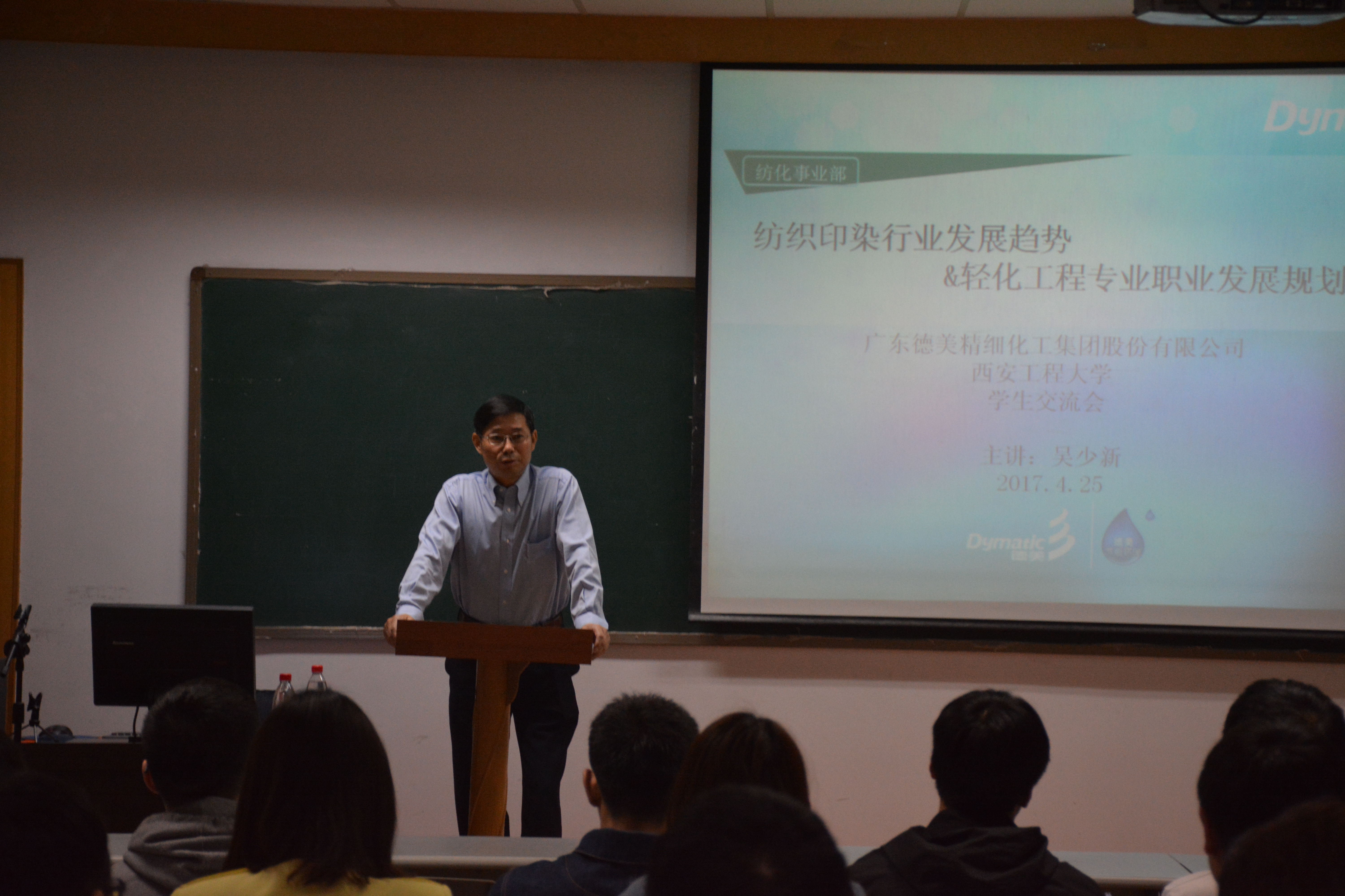 报告会上,吴少新总监围绕中国纺织产业在全球的地位、2016年中国纺织印染行业发展状况、2017年纺织染整行业推进节能减排措施、当前轻化工程专业本科生的就业方向、轻化工程专业本科生的职业发展规划和取得事业成功应当具备的素质和能力等在场学生关注的热点问题进行了阐述。吴总监的阐述引起了全场的共鸣,学生踊跃提问,现场气氛热烈。