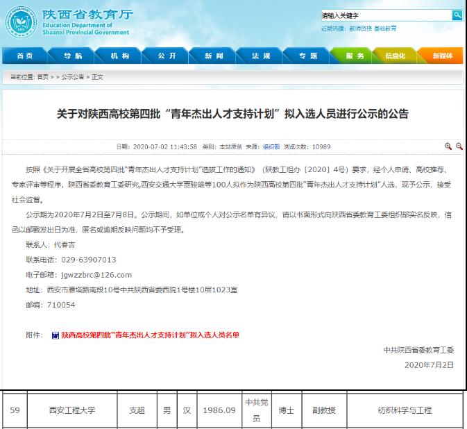 日前,中共陕西省委教育工委公布了陕西高校第四批“青年杰出人才支持计划”入选人员名单,我院青年教师支超博士成功入选。
