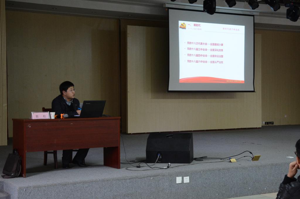 2017年11月10日下午,马克思主义学院郭松老师在大学生活动中心开展了“中国特色社会主义新时代新思想新纲领——”主题报告会。本场讲座由学生工作(部)处主办,纺织与材料学院承办,纺织与材料学院党委副书记郭西平主持了此次讲座。