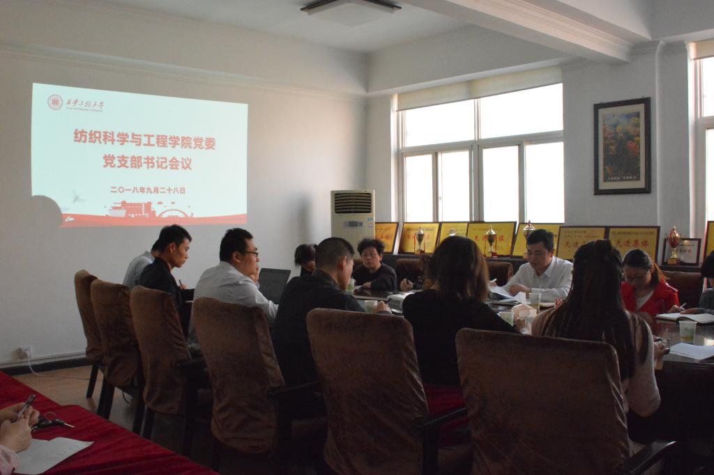9月28日,纺织学院党委在金花校区纺织楼4楼会议室召开新学期党支部书记会议,传达学习上级有关会议文件精神,安排部署新学期党建各项工作。学院党委书记胡小进、副书记郭西平、各党委委员和全体教工、学生党支部书记参加会议。会议由胡小进主持。