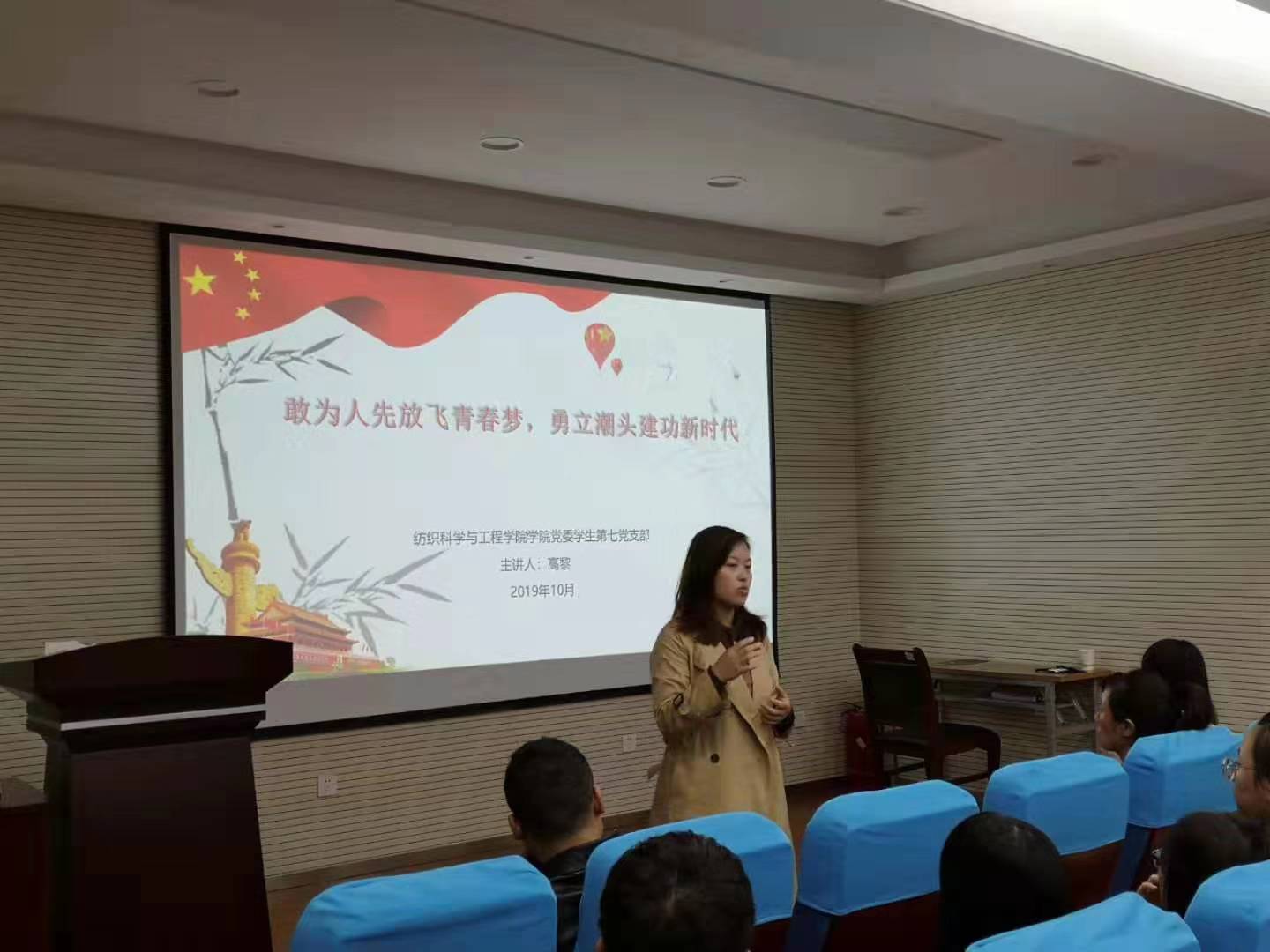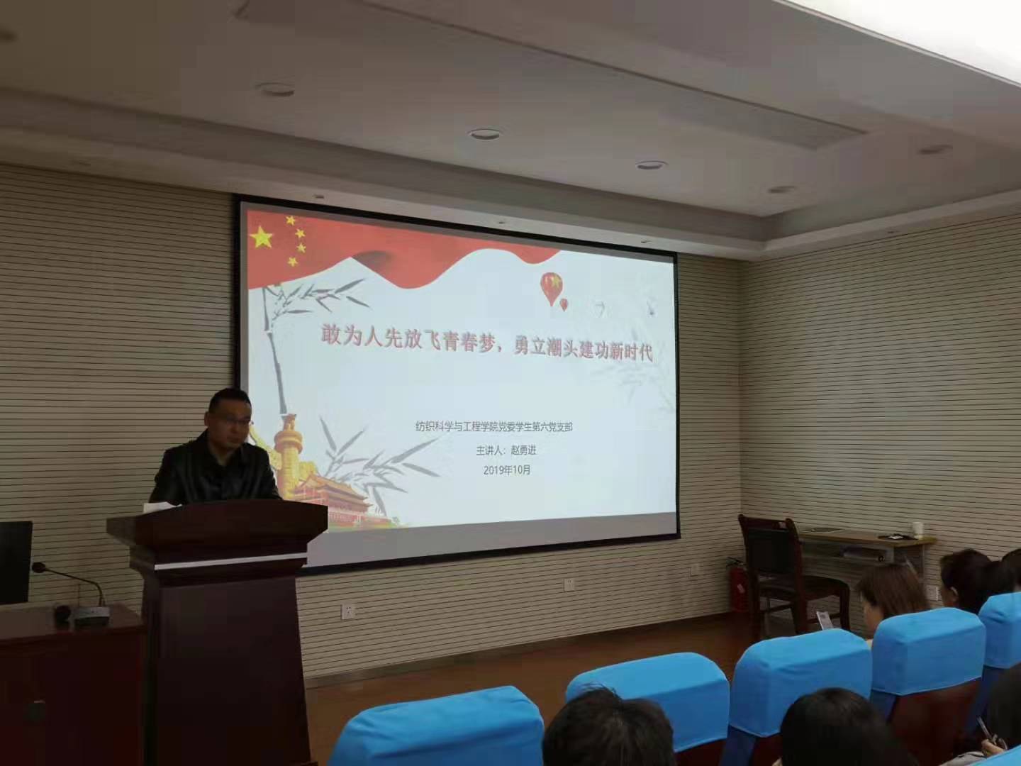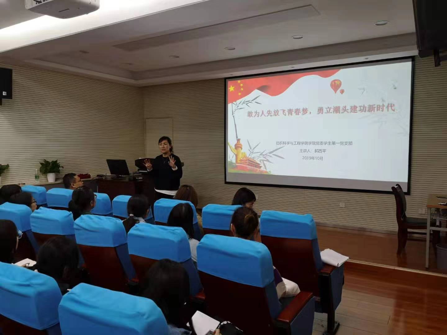 为深入学习贯彻“不忘初心、牢记使命”主题教育,进一步推动主题教育深入开展,2019年10月28日,纺织科学与工程学院党委在金花校区姚穆报告厅举办党支部书记联合讲党课活动。本次党课主题为“不忘初心、牢记使命,敢为人先放飞青春梦,勇立潮头建功新时代”,学院学生第一、第二、第四、第六、第七党支部全体党员参加活动。