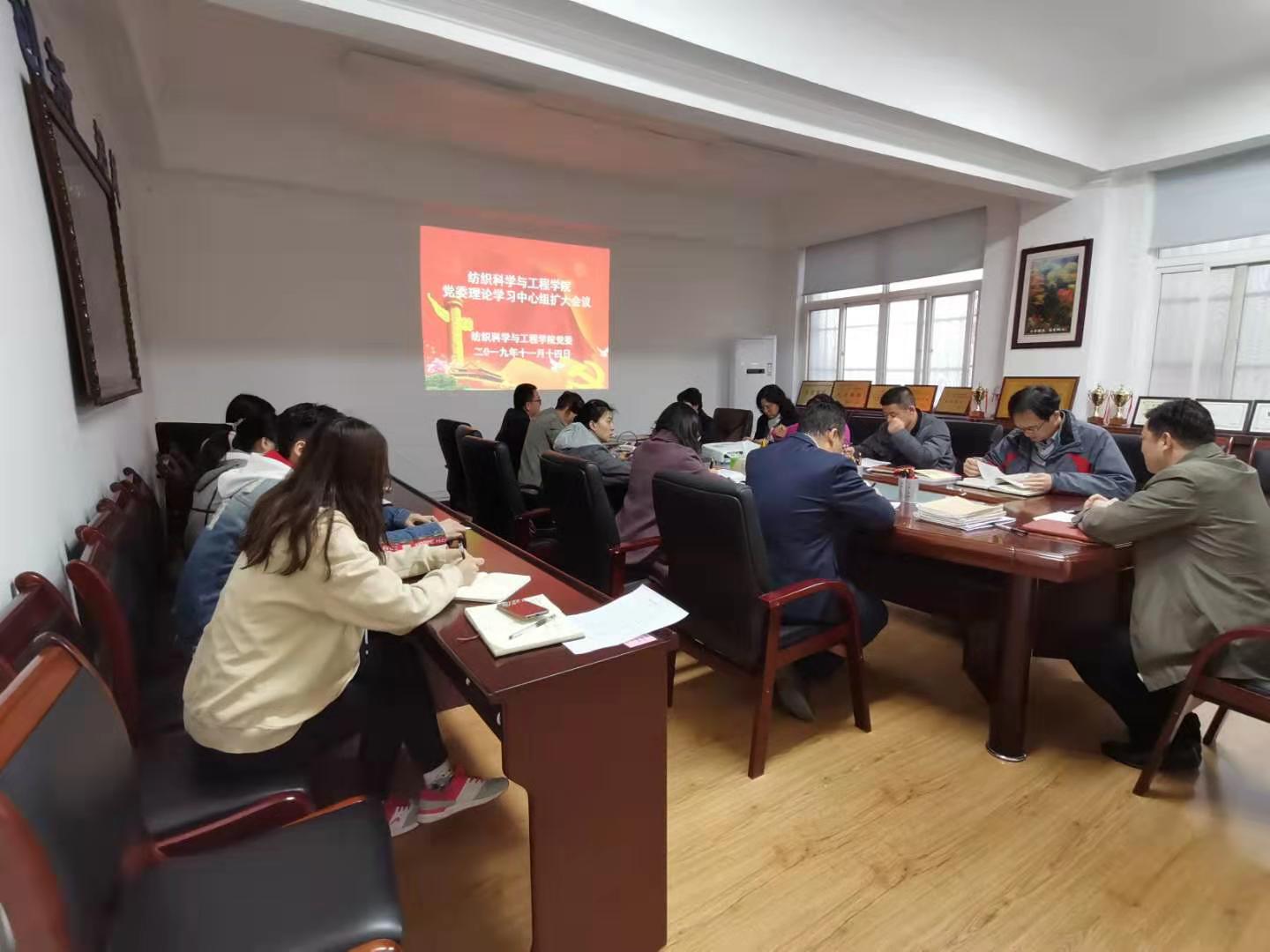2019年11月15日,纺织科学与工程学院党委在金花校区纺织楼四楼会议室召开党委理论中心组扩大会议,学院党委理论中心组成员和党支部书记参加会议。会议由党委书记胡小进主持。