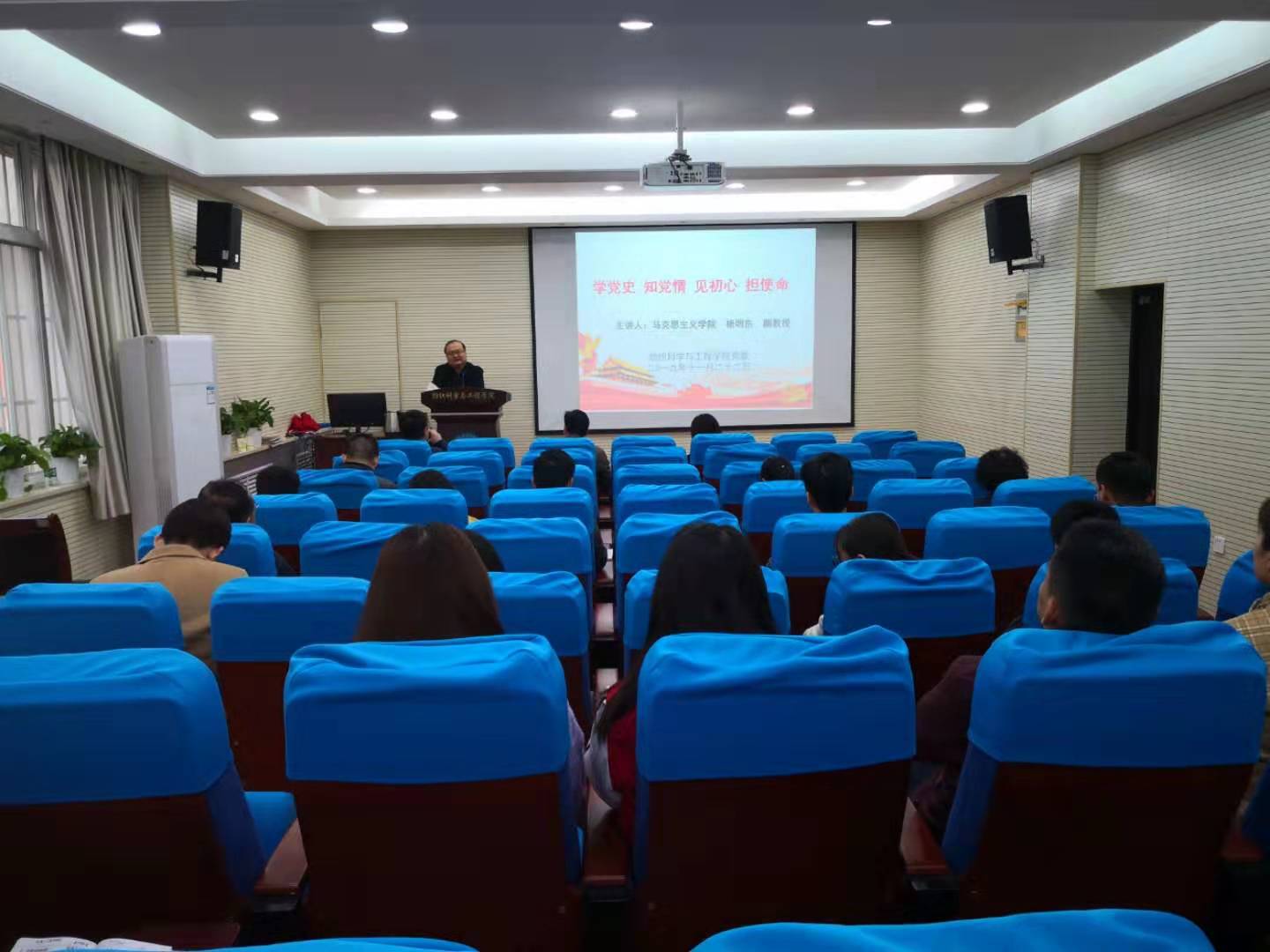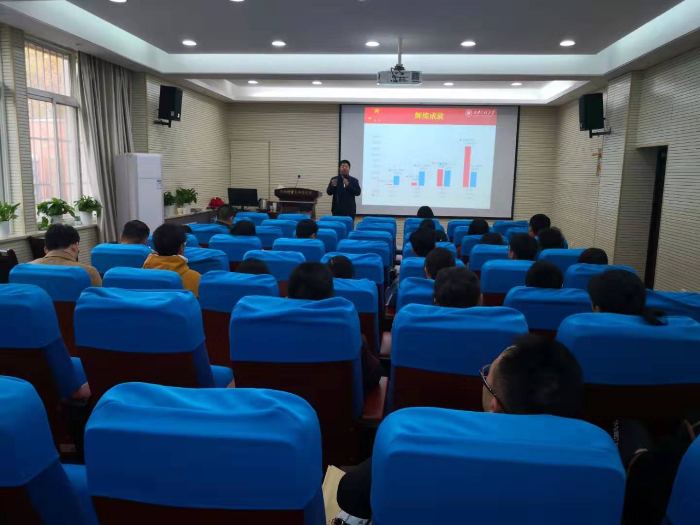 2019年11月22日,纺织科学与工程学院党委在金花校区姚穆报告厅举办“不忘初心、牢记使命”主题教育理论学习报告会。邀请我校马克思主义学院副院长郭松副教授和杨明东副教授分别作主题报告。学院党委理论学习中心组成员、党委委员、支部书记、支委和部分教师学生党员代表参加了报告会。报告会由学院党委书记胡小进主持。